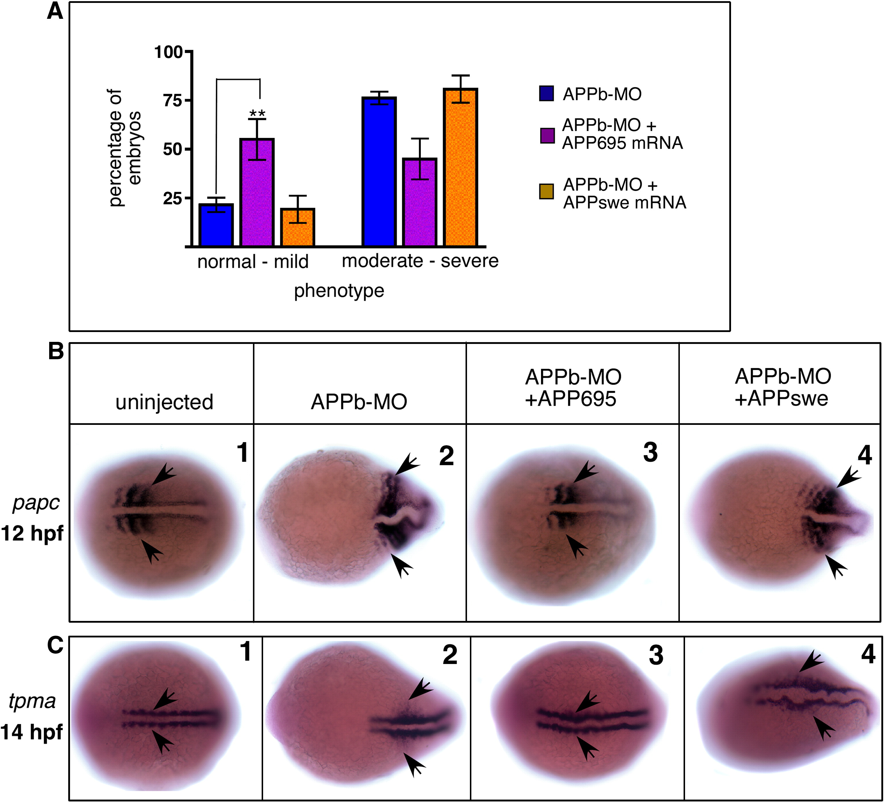 Fig. 5 APPswe does not rescue APPb morphant phenotype. (A) Quantification of embryos showing rescue from the short, curly tail phenotype. Whereas approximately 25% of embryos injected with APPb-MO alone appeared normal (blue bars), co-injection with wild-type APP695 mRNA (purple bars) showed over 50% embryos to be normal. There was a concomitant decrease in the number of embryos showing the severe phenotype. However, when injected with the same amount of mRNA encoding APPswe, there was no increase in embryos with normal phenotype, nor was there any decrease in embryos showing the severe phenotype (yellow bars). p > 0.05 by ANOVA. Error bars are ± S.E.M. ∗∗ p < 0.0044 between APPb-MO-injected embryos and those co-injected with APP695 mRNA. (B, C) APPswe mRNA does not rescue the defective convergent-extension phenotype. Embryos were fixed at 12 hpf and labeled with papc RNA probe (B) or fixed at 14 hpf and labeled with tpma RNA probe (C). In situ hybridization with papc at the 4–6-somite stage reveals wider somites in APPb-MO-injected embryos (2), which appear normal in embryos co-injected with APP695 mRNA (3) but not with APPswe mRNA (4). Similarly, in situ hybridization with tpma at the 6–8 somite stage show wider myotomal precursors and midline in APPb-MO-injected embryos (2) compared to uninjected embryos (1). Co-injection with APP695 mRNA (3) but not APPswe (4) reverses the increased width of the myotomal precursors and midline to near the width in uninjected embryos.