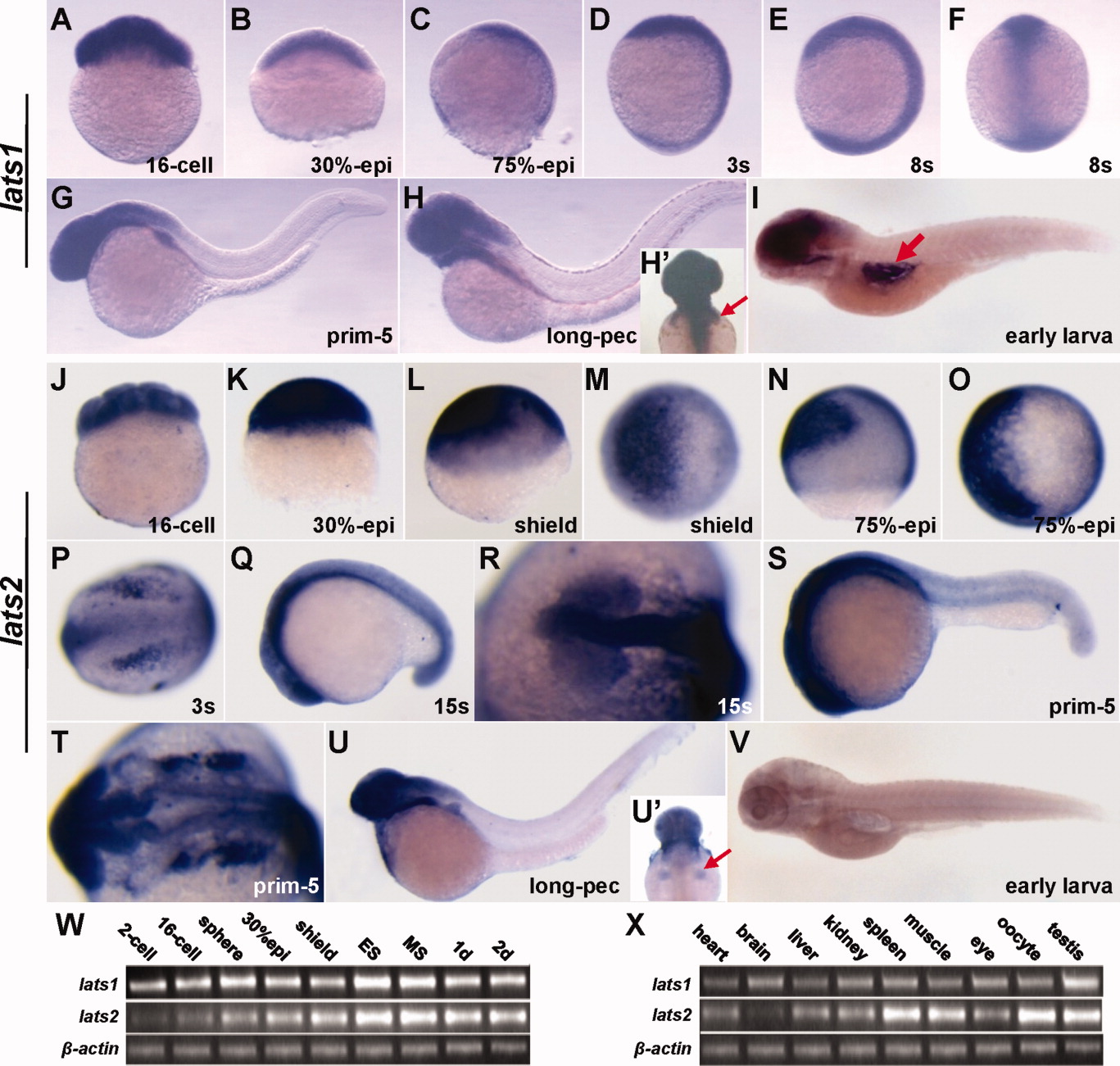 Fig. 2 Expression patterns of lats1 and lats2 during development and in adult tissues of zebrafish. A-I: Expression analysis of lats1 by whole-mount in situ hybridization (WISH) in embryogenesis. A: lats1 is maternally expressed as shown by the strong staining in 16-cell stage embryo. B-F: lats1 is ubiquitously expressed during later development until mid-somitogenesis. G,H: From prim-5 to long-pec stage, lats1 is prominently expressed in the anterior structures such as the brain and pectoral fins (indicated by red arrow in panel H′). I: At early larva stage, as indicated by red arrow, lats1 is remarkably expressed in the gas bladder. J-V: Expression analysis of lats2 by WISH in embryogenesis. J,K: Similar to lats1, lats2 is likewise maternally and ubiquitously expressed before 30%-epiboly. L-T: From shield stage, lats2 begins to present territory-specific expression patterns, besides a low-level ubiquitous expression throughout these developmental stages. L-O: From shield (L,M) to mid-gastrula (N,O) stage, lats2 probe strongly labeled the non-neural ectoderm cells. P-T: At the three-somite stage (P), lats2 is mainly expressed in the neural crest cells and the primordial CNS (central nervous system) cells; from mid-somitogenesis (Q,R) to prim-5 (S,T) stage, lats2 is notably expressed in the eyes and all the parts of encephalon as well as the neural crest derivatives. U: At long-pec stage, lats2 is prominently expressed in the anterior structures such as the brain and pectoral fins (indicated by red arrow in panel U′). V: At the early larva stage, in contrast to lats1, there is no obvious expression of lats2 in the gas bladder. W: By Reverse transcription polymerase chain reaction (RT-PCR) analysis, lats1 is ubiquitously expressed from the two-cell to long-pec stage, and in comparison to lats1, lats2 shows weaker expression at 2-cell stage and stronger expression from early-somitogenesis. X: In different tissues of adult, lats1 is almost ubiquitously expressed and lats2 is more prominently expressed in the spleen, muscle and gonads. Embryos in A-E,J-L,N are lateral view with dorsal to the right; embryo in F is dorsal view with animal pole to the top; embryos in M,O are animal pole view with dorsal to the right; embryos in P,R,T are dorsal view with anterior to the left; embryos in G-I,Q,S,U,V are lateral view with anterior to the left; embryos in H′,U′ are dorsal view with anterior to the top.