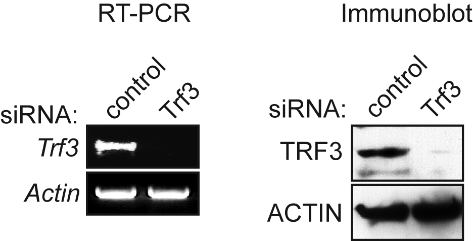 Analysis of Trf3 expression in mouse embryonic stem cells following siRNA-mediated knockdown of Trf3. RT-PCR (left) and immunoblot (right) analysis monitoring Trf3 knockdown following treatment with a control (luciferase) or Trf3 siRNA. Actin was monitored as a loading control.
