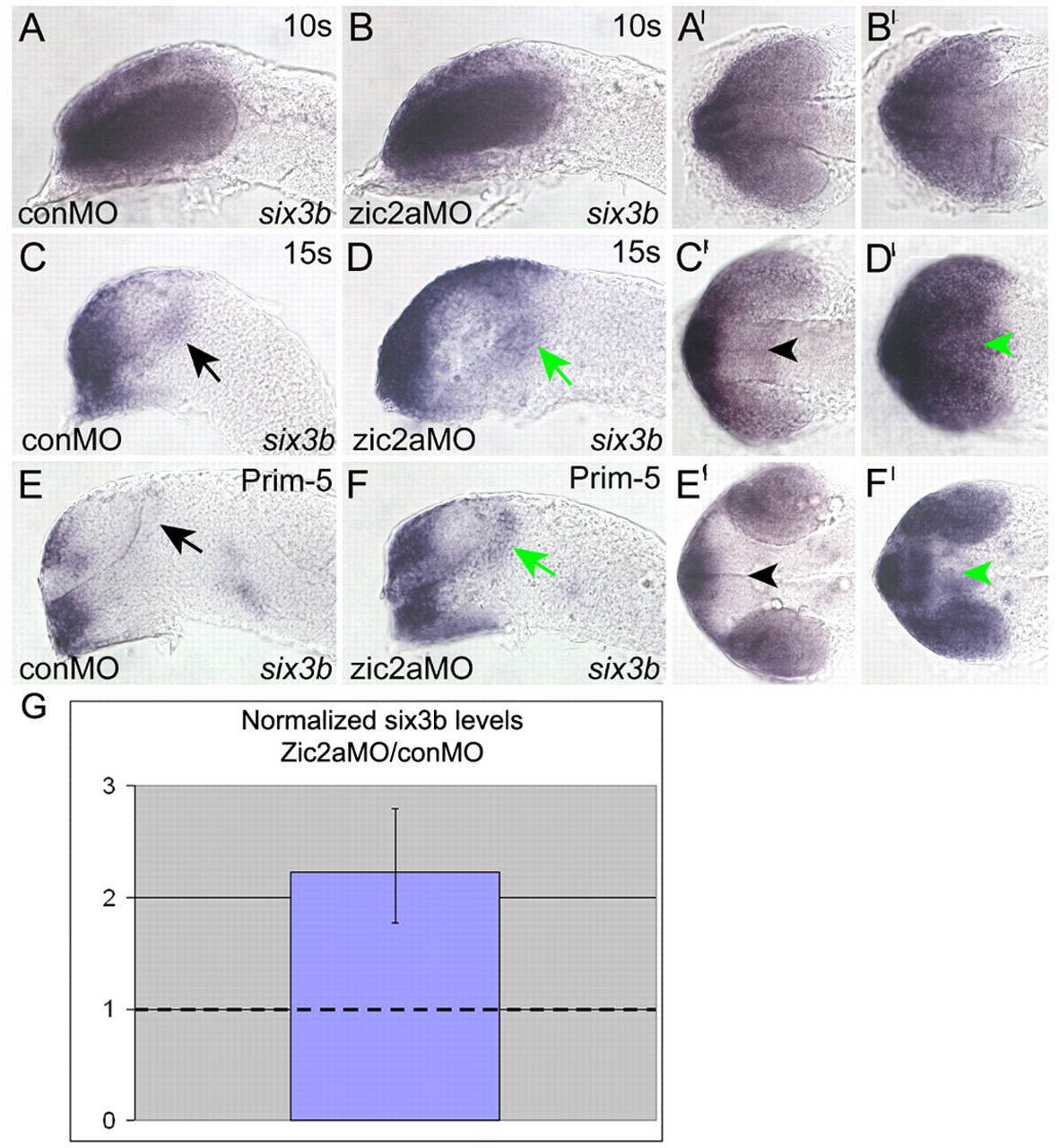 Fig. 2 Zic2a restricts six3b expression throughout the forebrain beginning at mid-somitogenesis. (A,B) six3b is similarly expressed in conMO- and zic2aMO-injected embryos at 10s-12s (A, 41/41 embryos, n=2; B, 57/57 embryos, n=2). (C,D) At 12s-15s, six3b expression is normal in control morphants (black arrowheads in C, 38/38 embryos, n=3), and expanded throughout the forebrain in zic2a morphants (green arrowheads in D, 58/58 embryos, n=3). (E,F) six3b expansion in zic2aMO-injected embryos persists at prim-5 (black arrowheads in E, 42/42 control morphants, n=3; green arrowheads in F, 40/41 embryos, n=3). (G) Real-time PCR showed that six3b levels, normalized to gapdh, were increased (P=0.0001) in ZicMO-injected embryos relative to control morphants (based on three biological replicates, with two technical replicates per biological replicate). A-F are lateral views; eyes have been removed from embryos in C-F. A′-B′ are ventral views of the same embryos. C′-F′ are dorsal views of the same embryos, anterior to the left.