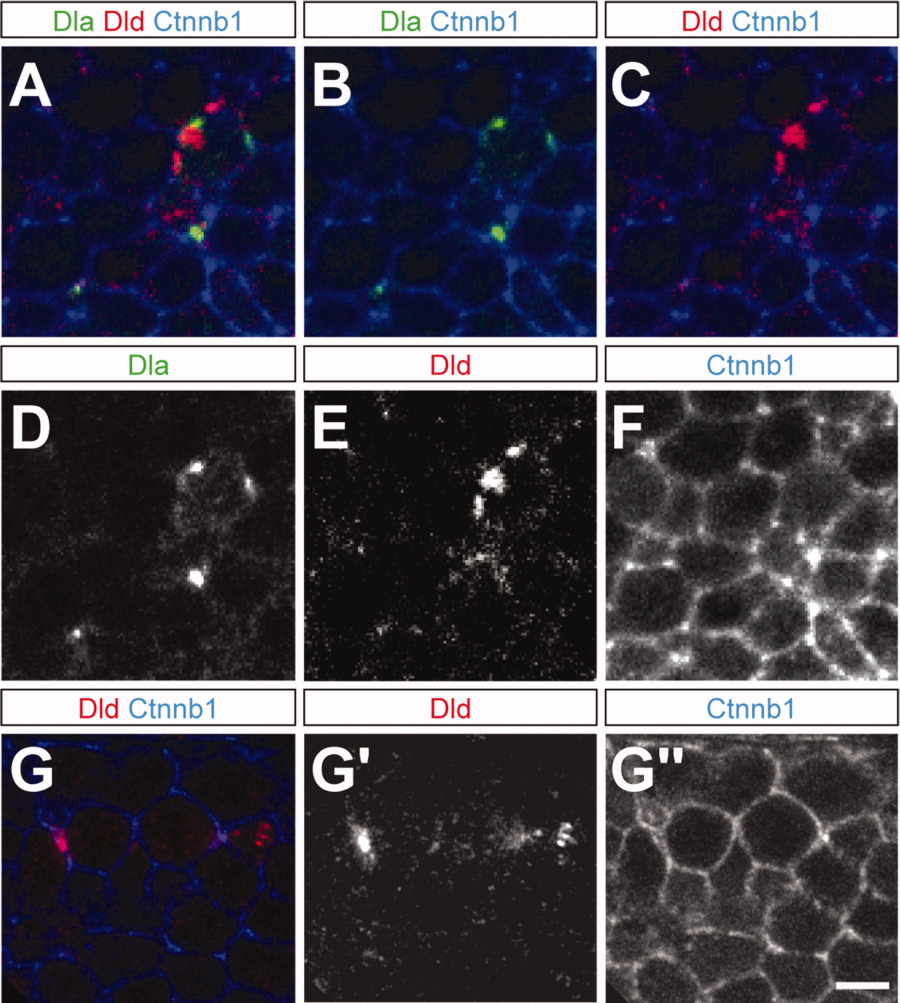 Fig. 7 Dla and Dld protein subcellular localization. Lateral views of two different 26 hours postfertilization (hpf) embryos (A-F and G-G″). A: Triple staining of Dla antibody (green), Dld antibody (red), and Beta-catenin antibody (Ctnnb1, blue) showing that both Dla and Dld often localize to the cell cortex and/or membrane. B: Dla (green) colocalizes with Ctnnb1 (blue). C: In many cases, Dld (red) overlaps with Ctnnb1 (blue) staining. D-F show the green, red and blue channels, respectively. G: Double staining of Dld antibody (red) and Beta-catenin antibody (Ctnnb1, blue) showing that in the same region of the nervous system, Dld can be in the cell cortex and/or membrane (left side of panel) and also cytoplasmic (right side of panel). G′,G″ show the red and blue channels, respectively. Scale bar = 2.7 μm.