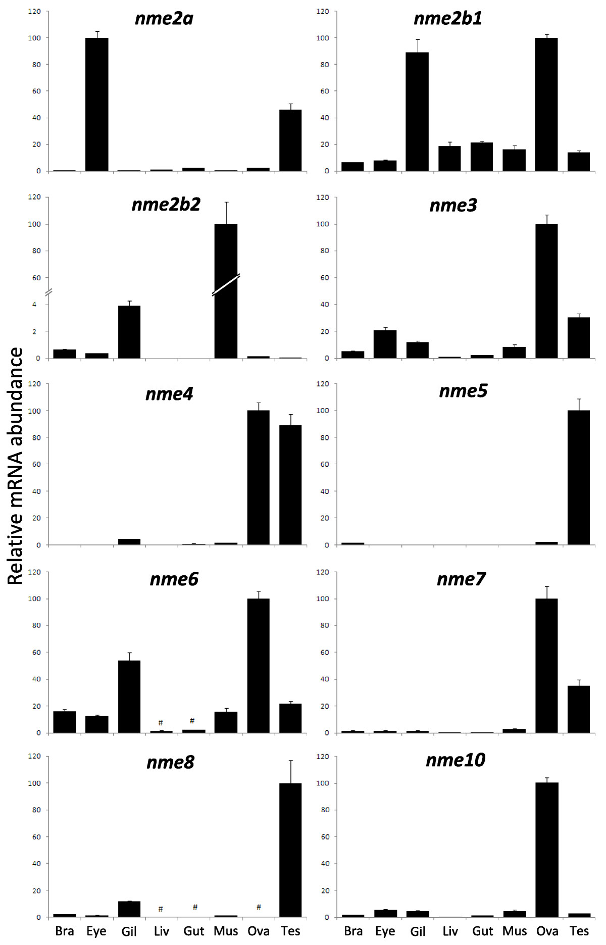 Fig. 10 Tissue distribution of zebrafish nme mRNAs. Tissue expressions of zebrafish nme2a, nme2b1, nme2b2, nme3, nme4, nme5, nme6, nme7, nme8, and nme10. Real-time PCR analysis was conducted using total RNA originating from the following tissues sampled in three different sexually-mature females: brain (Bra), eyes (Eye), gills (Gil), hepatopancreas (Liv), intestine (Gut), muscle (Mus), ovary (Ova), and three different mature males: testis (Tes). For each tissue, three separate reverse transcription (RT) reactions were carried out using separate RNA samples originating from three different fish. RT reactions were pooled and use to run real-time PCR in quadruplicates. Mean and SD are shown (n = 4). #, Expression levels not significantly different from background signal at p < 0.05. For all genes, relative abundance is expressed in percentage of highest tissue expression after signal normalization by 18S gene expression.