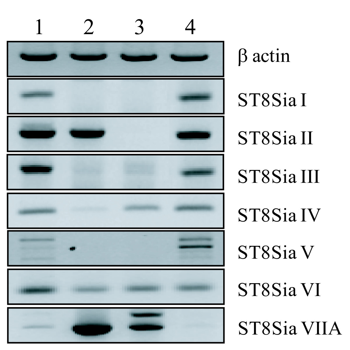 Fig. 2 Expression pattern of the zebrafish ST8Sia genes in various tissues, as determined by RT-PCR. Lane 1, 36 h embryo; lane 2, ovary; lane 3, intestine; lane 4, brain. The zebrafish β-actin gene was used as a positive control of PCR amplification.