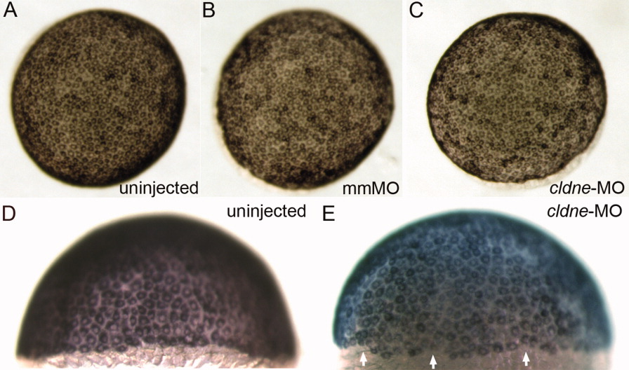 Fig. 4 Enveloping layer (EVL) specification is normal in cldne morphant embryos. A-E: Injected constructs indicated in lower right (A-C) and upper right (D,E). A-C: Animal pole views. D,E: Lateral views. E: EVL margin is irregular in cldne-MO injected embryos (arrows).