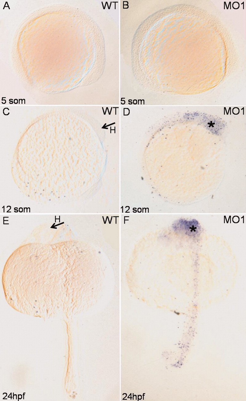 Fig. 9 Depletion of mga results in increased apoptosis in the head/brain region. Shown are representative TUNEL assays analyzing control wildtype (WT) or morphant (MO1) embryos at the stages indicated. There is no apparent apoptosis at early somitogenesis stages (A, B), while at the 12-somite or 24-hpf stage there is a significant increase in TUNEL-positive cells (asterisks). Note that apoptosis was not detected in heart or gut/endoderm. Views are: (A,B) lateral, dorsal to the top, and anterior to the right; (C,D) lateral, dorsal to the left, and anterior to the top; (E,F) dorsal, anterior to the top. H, head.