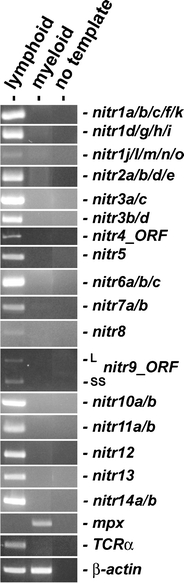 Fig. 3 RT-PCR analyses of NITR gene expression from different leukocyte populations. Lymphoid and myeloid cell populations were purified from the kidney of multiple zebrafish and pooled as described (Yoder et al. 2007). RT-PCR was performed as described in Fig. 2, except 1 μg of total RNA was used in the reverse transcription reaction. RT-PCR of myeloperoxidase (mpx) provides a positive control for myeloid cells and TCR-α provides a positive control for T lymphocytes. β-actin is shown as a standard reference. Primer sequences and thermal cycling parameters are listed in Table 1