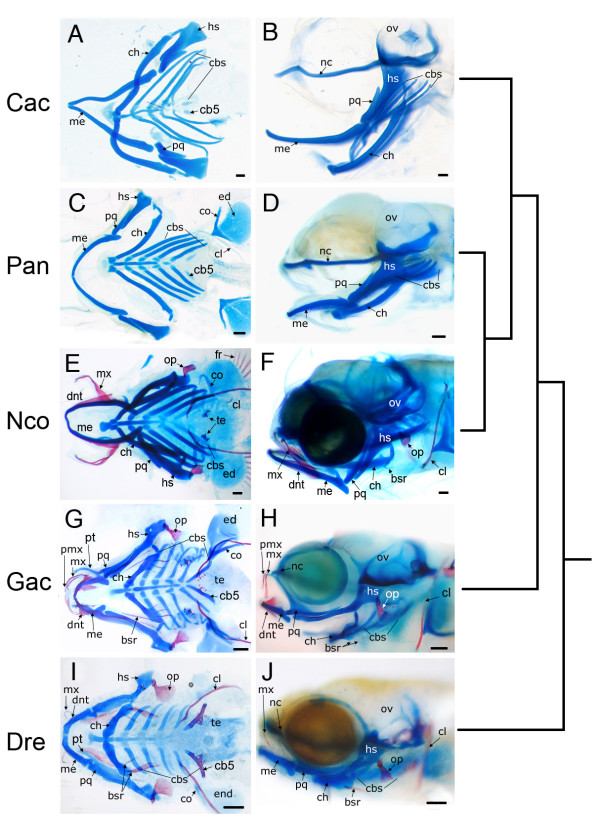 Fig. 1 Fish Specimens. Cleared and stained skeletal preparations of the Antarctic silverfish (P. antarcticum), the blackfin icefish (C. aceratus), the yellowbelly rockcod (N. coriiceps), the threespine stickleback (G. aculeatus), and the zebrafish (D. rerio) at comparable stages of development. Bone is stained red with Alizarin red and cartilage is stained blue with Alcian blue. (A, B) C. aceratus, mid-larvae; (C, D)P. antarcticum, mid-larvae; (E, F) N. coriiceps, mid-larvae; (G, H) G. aculeatus, 10 dpf; (I, J) D. rerio, 6 dpf. Both ventral flat mounted (A, C, E, G, I) and lateral (B, D, F, H, J) views are shown. Note the lack of bony elements in pelagic notothenioid species compared to the benthic notothenioid and outgroups. The tree to the right of the images indicates evolutionary relationships. Abbreviations: bsr, branchiostegal rays; cbs, ceratobranchal cartilages; cb5, 5th ceratobrachial cartilage; ch, ceratohyal; cl, cleithrum; co, corocoid; dnt, dentary; ed, endochondral disk; fr, fin rays; hs, hyosymplectic; me, Meckel′s cartilage; mx, maxilla; nc, neurocranium; op, opercle; ov, otic vesicle; pmx, premaxilla; pq, palatoquadrate; pt, pterygoid process of the palatoquadrate; te, teeth. Scale bars, 100 μm.