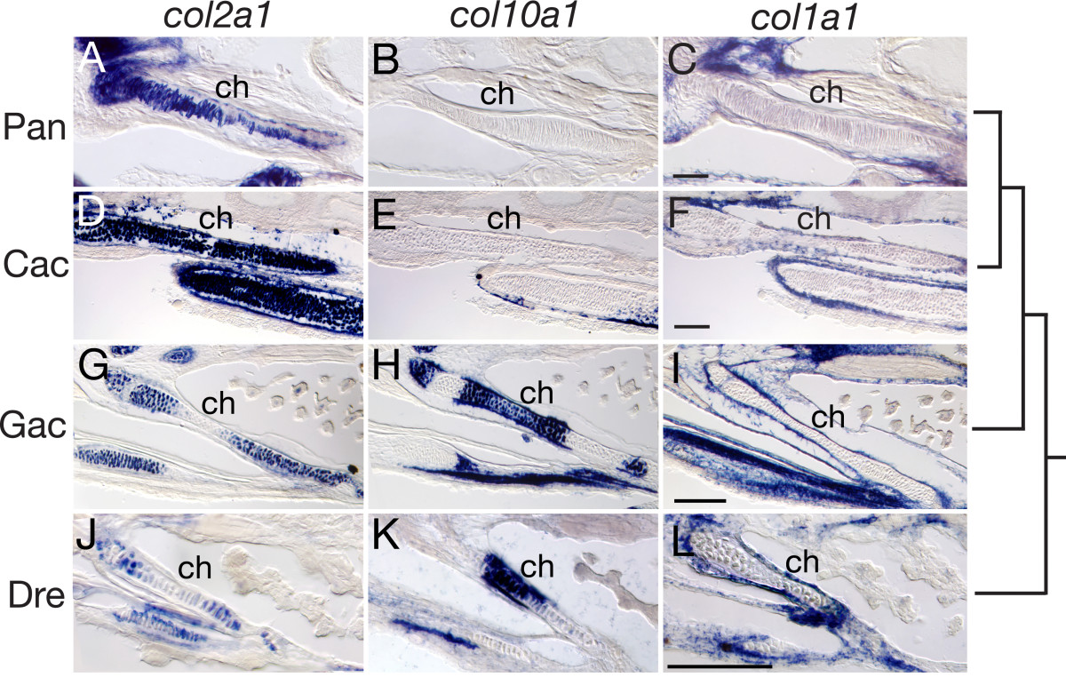 Fig. 4 Ceratohyal collagen gene expression in P. antarcticum, C. aceratus, G. aculeatus, and D. rerio detected by in situ hybridization on cryosections. (A-C) P. antarcticum, mid-larvae; (D-F) C. aceratus, mid-larvae; (G-I) G. aculeatus, 11 dpf; (J-L) D. rerio, 6 dpf. Sections through the ceratohyal cartilage (ch) are shown in the ventral view. Notothenioid larvae show ubiquitous expression of col2a1 throughout the ch (A, D), whereas col2a1 expression is restricted to the distal ends of the cartilage in both G. aculeatus (G) and D. rerio (J). The col10a1 gene is expressed in hypertrophic chondrocytes in the ch in G. aculeatus (H) and D. rerio (K), whereas its expression is absent from the ch in P. antarcticum (B) and C. aceratus (E). The col1a1 gene is weakly expressed in the periosteum around the ch of both P. antarcticum (C) and C. aceratus (F) relative to the strong expression observed in G. aculeatus (I)and D. rerio (L). The tree represents the evolutionary relationship among species. Scale bars, 100 μm.