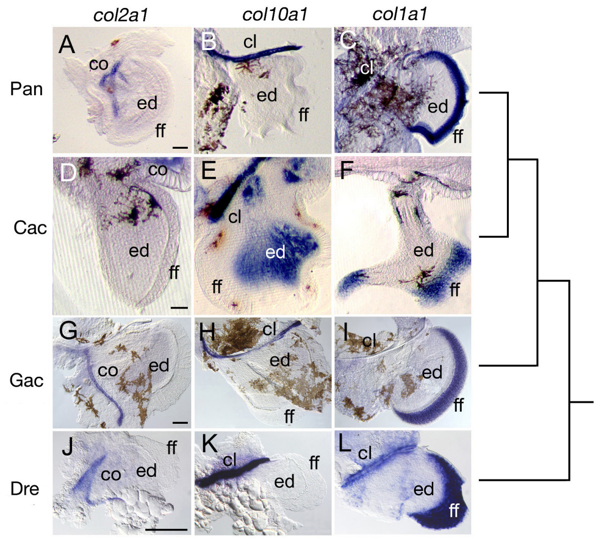 Fig. 5 Expression of collagen genes in the pectoral fins of P. antarcticum, C. aceratus, G. aculeatus, and D. rerio embryos, detected by whole-mount in situ hybridization. (A-C) P. antarcticum, mid-larvae; (D-F) C. aceratus, mid-larvae; (G-I) G. aculeatus, 7 dpf; (J-L)D. rerio, 3 dpf. Images are of flat-mounted (A-C, G-L) or vibratome-sectioned (D-F) pectoral fins. Expression of col2a1 is observed in the scapulocoracoid (co) of all species (A, D, G, J). Likewise expression of col10a1 (B, E, H, K) and col1a1 (C, F, I, L) is observed in the cleithrum (cl), and col1a1 is expressed in the fin fold (ff) of all species. C. aceratus exhibits a unique pattern of col10a1 expression in the endochondral disk (ed) (E). Thus, gene expression during fin development appears to be largely conserved among these species. The tree represents the evolutionary relationship among species. Scale bars, 100 μm.