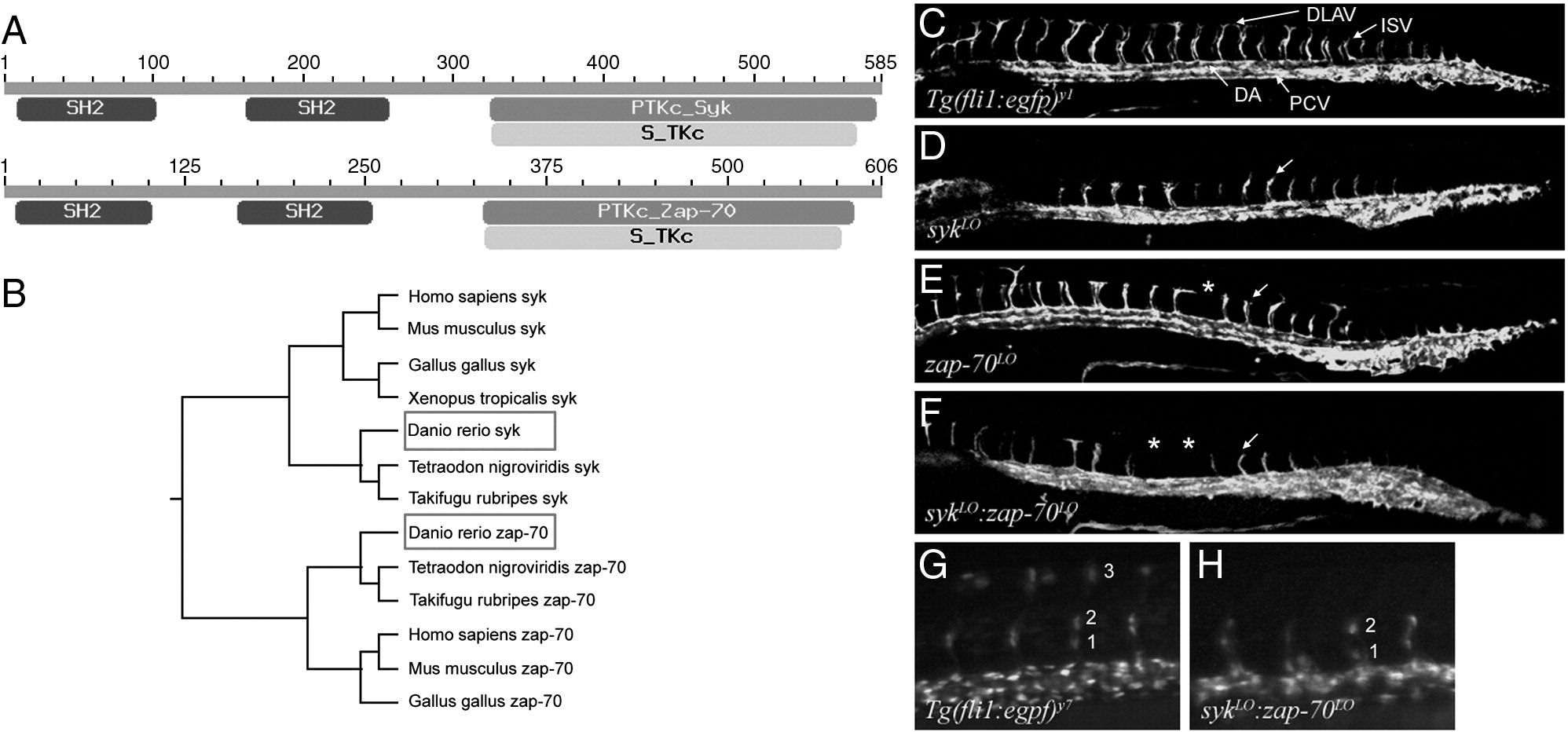 Fig. 1 The zebrafish orthologs of syk and zap-70 mediate angioblast migration to form the ISVs. (A) Zebrafish syk and zap-70 have similar domain structures with N-terminal SH2 domains, and a C-terminal tyrosine kinase domain (PTK). (B) Alignment of the nucleotide sequences of syk and zap-70 with orthologs in other species shows a clear grouping of zebrafish syk with the other syk orthologs, and zap-70 with the other zap-70 orthologs. (C) At 30 hpf, ISVs in Tg(fli1a:EGFP)y1 embryos have reached the dorsal aspect of the somite and are contributing to the DLAV in wild-type embryos. (D–E) Injection of a low dose of syk morpholino (sykLO, D) or zap-70 morpholino (zap-70LO, E) results in delayed (arrows) or completely suppressed (asterisk) angioblast migration to form the ISVs. (F) Co-injection of low doses of both morpholinos results in a more severe stalling and suppression of angioblast migration (sykLO:zap-70LO). (G–H) Tg(fli1a:EGFP)y7 embryos with endothelial-expressed nuclear GFP show fewer cells in the ISVs of sykLO:zap-70LO embryos. Anterior is to the left in all embryos. DA: dorsal aorta; PCV: posterior cardinal vein; ISV: intersegmental vessel; DLAV: dorsal longitudinal anastomotic vessel; hpf: hours post fertilization.