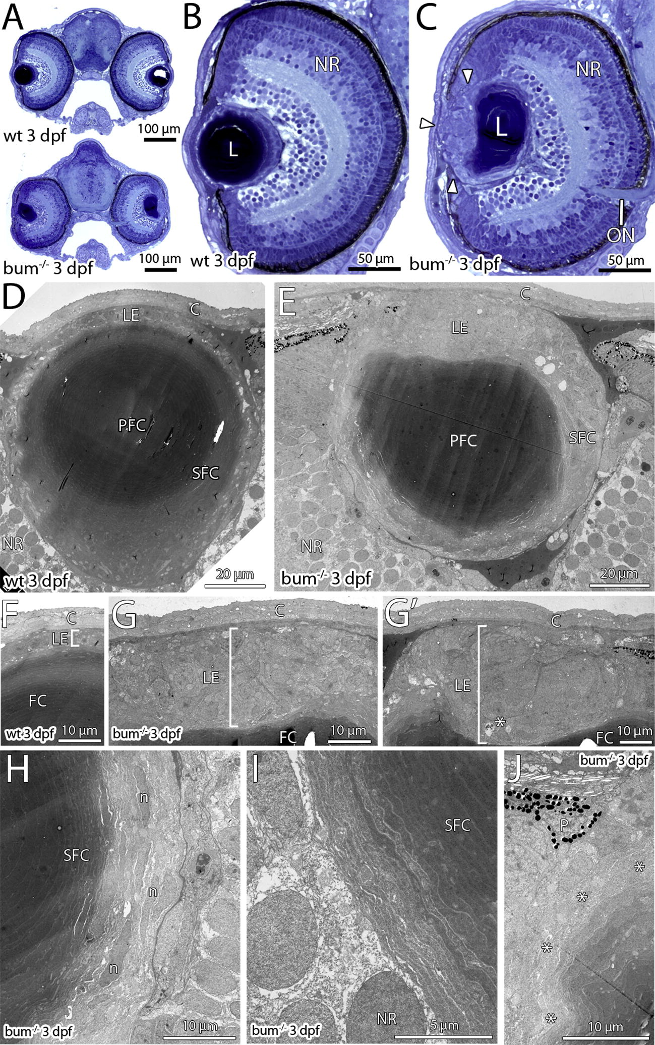 Fig. 1 The lens in 3 dpf bum-/- zebrafish shows the onset of a hyperproliferation of the anterior epithelium. (A–C) Toluidine blue-stained transversal semi-thin sections through the central part of the eyes of 3 dpf sibling (wild-type, wt; top picture in A and B) and bum-/- mutant zebrafish larvae (bottom picture in A and C). (A) Cross-sections of entire heads, (B and C) higher magnifications of individual eyes. Note the onset of a hyperproliferation of the anterior lens epithelium in the mutant (C; white arrowheads). The overall morphology of the eye however, including the layers of the neural retina (NR), is normal in bum-/- mutant larvae (compare B and C). (D–J) Thin-section electron microscopy images of transversal sections through the central part of the eyes of 3 dpf sibling (D, F) and bum-/- (E, G–J) zebrafish larvae. (D, E) Overviews showing the morphology of the entire lens. (F, G) Higher magnifications of the anterior lens epithelia in sibling (F) and bum-/- (G, G′) zebrafish larvae. Note that the epithelium (brackets) forms a monolayer in the wild-type larvae, but is expanded to several cell layers in the mutants. Occasionally, apoptotic cells can be observed in the mutant lens epithelium (asterisk in G′). (H, I) Higher magnifications of the lens’ bow region in bum-/- mutant zebrafish larvae showing the differentiating secondary lens fibre cells, which at this stage do not yet show the massive degenerative changes observed at later developmental stages (see [Fig. 2] and [Fig. 4]). (J) Slight deformation of the outer cortex of a bum-/- mutant lens anterior of the lens’ equator. Asterisks denote superficial secondary lens fibre cells that show the first signs of cellular swelling. Abbreviations: C, cornea; PFC, primary lens fibre cells; L, lens; LE, lens epithelium; n, secondary lens fibre cell nuclei; NR, neural retina; ON, optic nerve; P, pigment granules of the iris; PFC, primary lens fibres; SFC, secondary lens fibre cells.