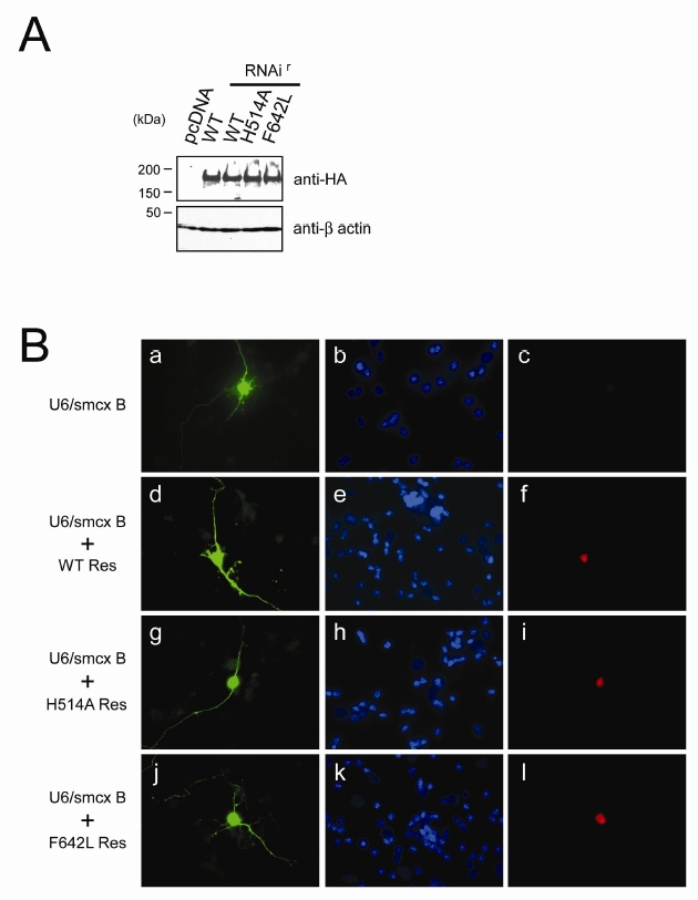 (A) Expression of RNAi-resistant SMCX in 293T cells. Equal amount of pcDNA3.0 vector or expression plasmid carrying RNAi-resistant WT, H514A, or F642L SMCX was transfected into 293T cells, and resulting cell lysates were analyzed by Western blotting using anti-HA monoclonal antibody. β-actin was used as a loading control. All constructs gave comparable expression level.