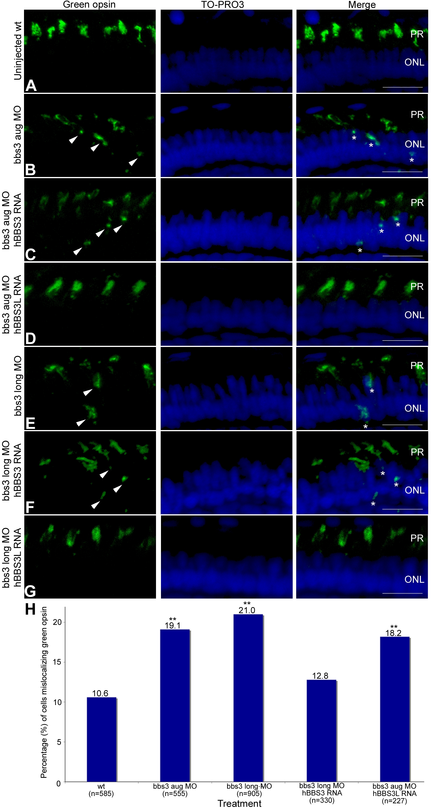 Immunofluorescence of green cone opsin (green) on transverse cryosections of 5-day-old embryos (A) uninjected wild-type, (B) bbs3 aug MO, (C) bbs3 aug MO and hBBS3 RNA, (D) bbs3 aug MO and hBBS3L RNA, (E) bbs3 long MO, (F) bbs3 long MO and hBBS3 RNA, and (G) bbs3 long MO and hBBS3L RNA. To-Pro3 was used to counterstain the nuclei (blue). In bbs3 aug (B) and bbs3 long morphants (E), green opsin was not restricted to the outer segment of the photoreceptors and was detected in the cell bodies of the outer nuclear layer (arrowheads and asterisks). Expression of hBBS3L RNA improved green opsin localization in both bbs3 aug (D) and bbs3L (G) morphants. Of note, hBBS3 RNA failed to rescue green opsin localization in bbs3 aug (C) and bbs3 long (F) morphant embryos (arrowheads and asterisks). OS, outer segment; ONL, outer nuclear layer. Scale Bar 10 µm. (H) The percentage of mislocalizing green opsin cells. The sample size (n) is noted on the x-axis and represents the total number of green opsin positive cells counted. **Fisher′s exact test, p<0.01.