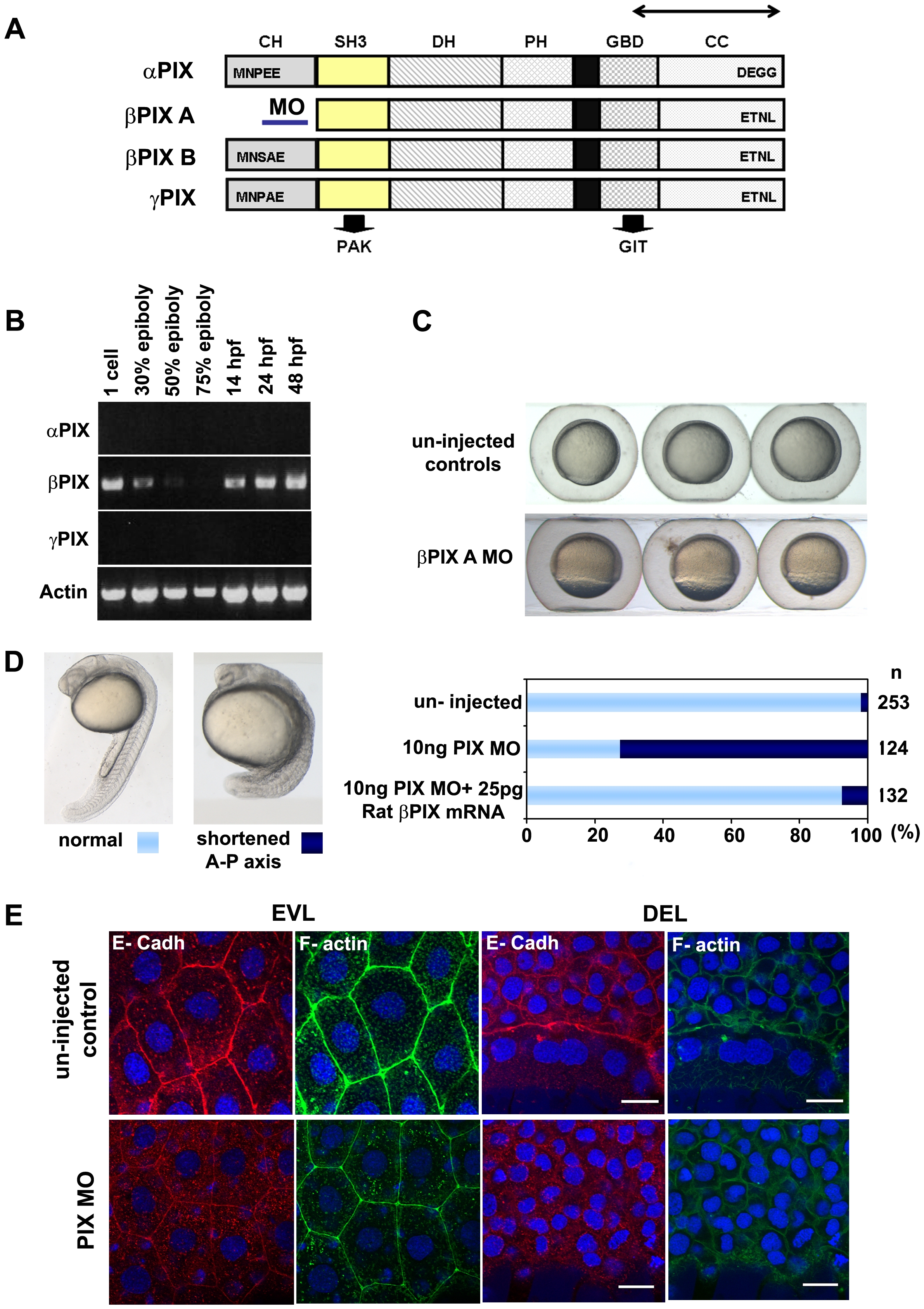 (A) Schematic of zebrafish PIX isoforms designated αPIX, βPIX-A, βPIX-B [7] and the newly described γPIX. Arrows indicate the positions of the oligonucleotide primers used for RT-PCR. The position of the PIX-MO at the 5′ UTR of βPIX-A is indicated: this transcript encodes the smaller PIX isoform which is equivalent to the ubiquitous mammalian βPIX. SH3 domain in yellow and GBD binds to PAK and GIT respectively. (B) Transcript profile showing RT-PCR products for PIX at the developmental stages indicated. Primers cover essentially the same region of the PIX ORFs and therefore do not discriminate between the alternate spliced forms at the 5′ terminus. (C) PIX morphant embryos exhibit epibolic delay compared to un-injected controls at 8 hpf. (D) The typical phenotype of embryos depleted of βPIX-A at 24 hpf, exhibit shortened AP axes suggesting gastrulation defects. Phenotypic analysis showing significant rescue at 24 hpf after co-injection with 25 pg of rat βPIX mRNA. (E) Reduced cell junctional E-cadh signals in the EVL and DEL after PIX knock-down. The level of cortical F-actin (phalloidin) is similar to controls but the junctional network is more irregular. Intracellular E-cadh puncta suggest PIX functions downstream of Chp to maintain E-cadh at cell adhesions. Scale bars = 20 μm.