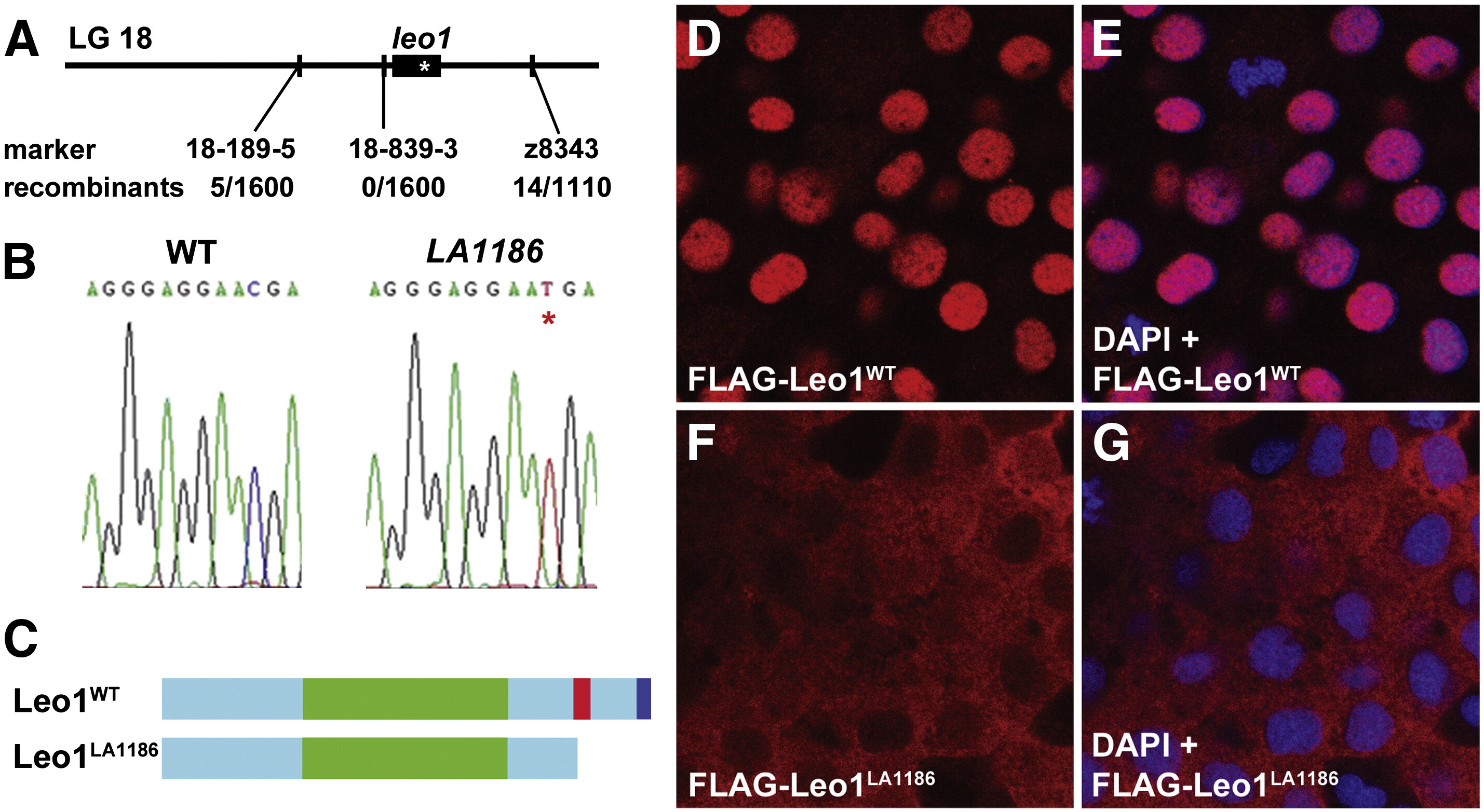 Fig. 2 Positional cloning of Leo1LA1186. (A) LA1186 was mapped to linkage group 18 between markers z8343 and 18-189-5. No recombinants were detected between LA1186 and the custom marker 18-839-3 from 1600 meioses. Asterisk marks the position of the nonsense mutation. (B) Sequencing of the leo1 locus in wildtype and LA1186 embryos identified a C to T transition, resulting in a premature stop codon (*). (C) Schematic diagram of the molecular structure of leo1. Zebrafish Leo1WT contains a Leo1 domain (green), nuclear localization sequence (red), and an aspartic acid-rich tail (dark blue). The Leo1LA1186 protein is truncated prior to the nuclear localization sequence. (D, E, F, G) Cellular localization of Leo1WT and Leo1LA1186. FLAG-tagged Leo1WT (D) colocalized with DAPI (E) in the nucleus. FLAG-tagged Leo1LA1186 was detected mostly in the cytoplasm (F, G). FLAG, red; DAPI, blue.