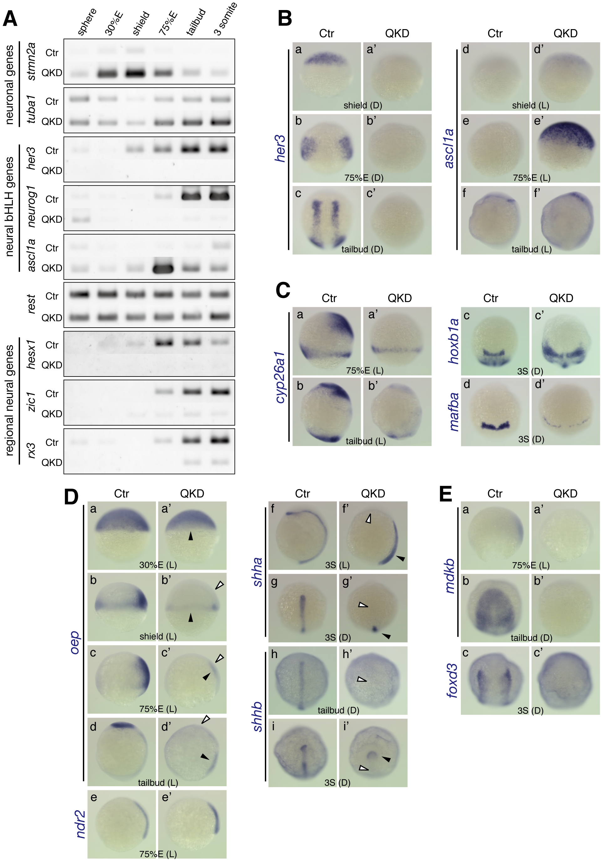 (A) Altered expression of genes involved in neural differentiation. RT-PCR analysis of the indicated genes was performed as described in Figure 4C. (B) Effects of B1 sox QKD on neural bHLH gene expression. The her3 expression is totally lost in the QKD embryos (a–c), whereas ascl1a is transiently upregulated at 75%E in a broad area of the neuroectoderm (d–f). (C) The loss of cyp26a1 expression in the anterior neuroectoderm (a, b) and evidence of hindbrain patterning defects: expansion of hoxb1a expression (c) and a severe reduction of mafba expression (d). (D) The loss of expression of oep and shha/b in the neuroectoderm of the QKD embryos. (a–d) In the QKD embryos, the expression of oep is lost in the ectoderm at the shield stage (b) and the neuroectoderm at the 75%E and tailbud stages (c, d) (marked by open arrowheads in b′–d′), whereas its initial zygotic expression (a) and mesodermal expression (b–d) are maintained (closed arrowheads in a′–d′). (e) ndr2 is also expressed in the QKD mesoderm at normal levels. (f–i) The expression of shha/b in the neuroectoderm is lost (marked by open arrowheads in f′–i′), whereas that in the mesoderm is retained (closed arrowheads in f′–i′). (E) The loss of mdkb expression in the neuroectoderm and severe reduction of foxd3 expression in the neural crest cells of QKD embryos.