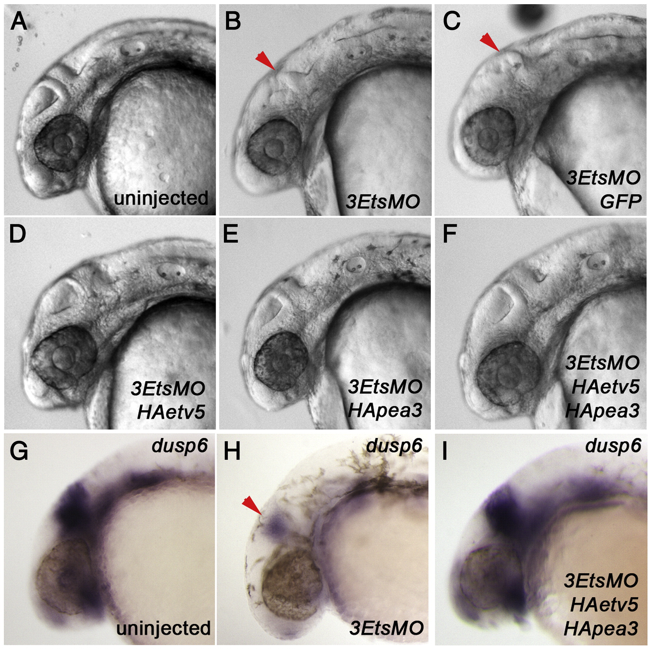 Fig. 2 The Pea3 ETS factors perform redundant functions and are required for mid–hindbrain boundary (MHB) formation. (A–I) Lateral views of 28hpf embryos. Injection of antisense morpholinos targeting pea3, erm and etv5 (3EtsMO) resulted in MHB defects (B) as compared to the Control scrambled morpholino (A). 3EtsMO-induced MHB defects can be rescued by co-injection of HAetv5 or HApea3 mRNA (D–F) but not by GFP mRNA (C). Expression of dusp6 is diminished in 3EtsMO-injected embryos (H). Co-injection of HAetv5 and HApea3 rescued dusp6 expression (I). Red arrowhead marks loss of MHB in MO-injected embryos.