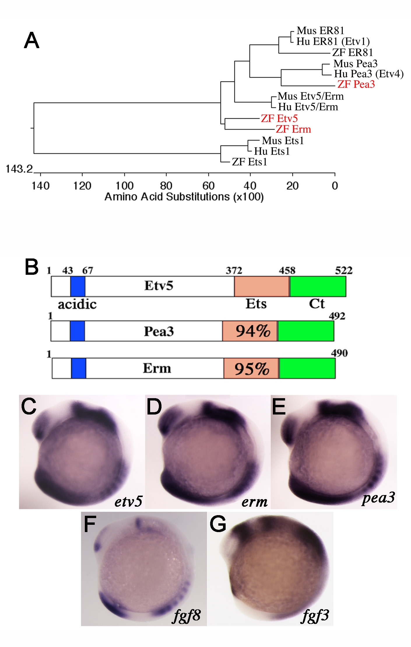 Fig. S1 Comparative expression of Pea3 ETS transcription factors during zebrafish development. (A) Phylogenetic alignment of selected zebrafish (red), mouse and human PEA3 ETS factors. (B) Diagram of structural features of Pea3 ETS proteins showing the conserved acidic region (acidic), ETS DNA binding domain (Ets), and carboxyl region (Ct). Percent identities between Etv5 ETS domain to Pea3 and Erm are listed. (C–G) Lateral views at 10-somite stage. In situ probes indicated on the bottom right corner. Pea3 ETS transcription factors have overlapping expression patterns and are similar to that of fgf3 and fgf8 ligands.