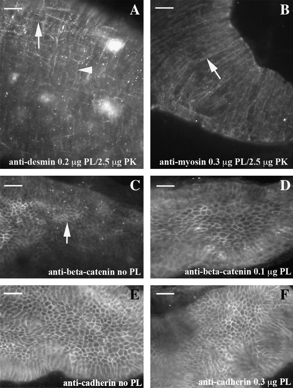 Fig. 1 PLA2 retrieves cytoplasmic antigens. Patterns within the dissected intestine are shown with either a combination of PLA2 and proteinase K or PLA2 alone using 96 hpf embryos. Desmin IHC (A) reveals a robust and reproducible pattern with a combination of PLA2 and a low concentration of proteinase K. Both longitudinal muscle (arrow) and circular (arrow head) are observed. Smooth muscle myosin heavy chain IHC (B) shows strong staining within circular muscle (arrow) with a combination of PLA2 and proteinase K. Both beta-catenin (C) and cadherin (E) IHC display part or all of the pattern without antigen retrieval. Addition of an intermediate concentration of PLA2 creates an even pattern of beta-catenin (D), while high levels of PLA2 do not result in distortion of the cadherin pattern (F). In all panels, anterior is left and posterior is right. Scale bar is 20 μM at top left corner. PLA2, phospholipase A2; IHC, immunohistochemistry.