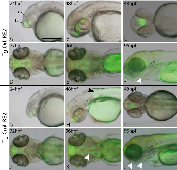 Fig. 3 Expression of URE2-GFP reporter transgenes in zebrafish. The Tg-DrURE2 drives GFP expression in the forebrain starting at 24 hpf until at least 96 hpf (A-F). At 96 hpf GFP expression is also observed in the pharyngeal arches (E, F). The Tg-CmURE2 drives GFP expression in the forebrain at 24 hpf until at least 96 hpf (G-L). GFP expression is also first noticed in the somites and pharyngeal arches at 48 hpf (H) and 96 hpf (K, L), respectively. Panels A, B, F, G, H, L are lateral views, anterior to the left and dorsal to the top; panels C, D, E, I, J and K are ventral views. t: telencephalon; d: diencephalon. White arrowheads indicate pharyngeal arch expression and the black arrowhead indicates somite expression. Scale bar: 250μm.