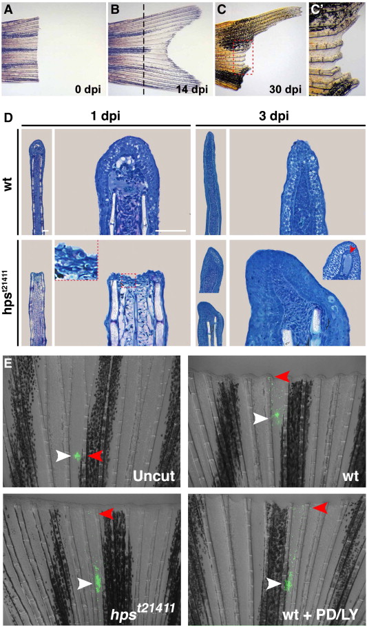 Initial events of wound healing occur in ErbB3 mutants. (A and B) In wild-type adults, caudal fin regeneration is completed around 10 days post-injury (dpi). (C and C′) Conversely, homozygous mutants for the ErbB3 allele hpst21411 do not regenerate properly even after 30 dpi. (D) At the histological level, closure of the wound epidermis is not affected in homozygous mutants for hpst21411 at 1 dpi compared to wild-type controls although the formation of the blastema is delayed. At 3 dpi, the blastema in homozygous mutants is smaller compared to wild-type controls. Additionally, the distal blastema is absent in some individuals (arrowhead on inset). All sections are longitudinal. Scale bar 50 μm. (E) Polymorphonuclear leukocytes (PMNs) migrate to the wound site in wt animals, ErbB3 mutants and wt animals incubated with ErbB/PI3K (PD/LY) inhibitors. The initial site of DiI injection and the location of putative PMNs at 24 hpi is demarcated with white and red arrowheads, respectively. Most labeled cells migrate towards the amputation plane.