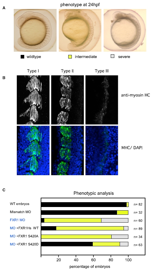 (B) FXR1 leads to disorganization of muscle fibers. Muscle organization in the three classes of embryos illustrated in (A) was assessed by myosin heavy-chain (HC) staining and confocal imaging (5 μM section), with nuclei counterstained by DAPI.