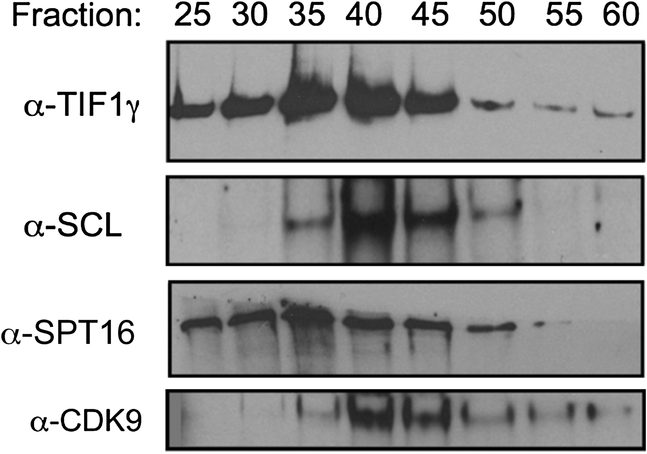 Fig. S5 Gel-Filtration and Western Blot Analyses Showing Coelution of TIF1γ, SCL, CDK9, and SPT16 in K562 Cells, Related to Figure 6