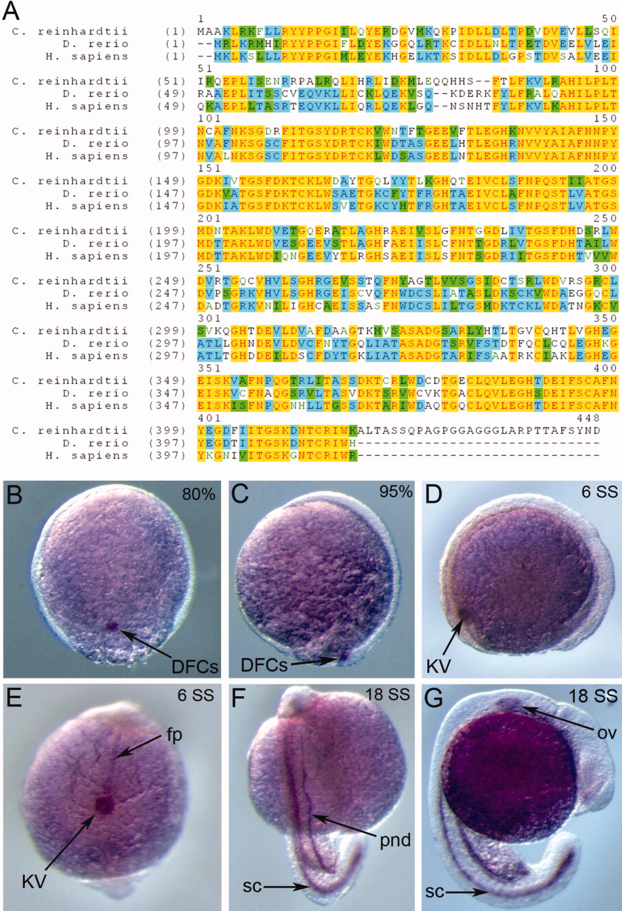 Fig. 1 Zebrafish wdr69 is expressed in cells that assemble motile cilia. A: Protein sequence alignment of Oda16 homologs from Chlamydomonas reinhardtii, Danio renio, and Homo sapiens. Yellow color highlights conserved residues among the three species, blue color highlights residues conserved in two species and green color highlights conservative replacements. B-G: RNA in situ hybridizations detecting wdr69 expression during early zebrafish development. B,C: At the 80% (B) and 95% (C) epiboly stages, wdr69 is expressed exclusively in dorsal forerunner cells (DFCs). D,E: At the six somite stage (SS), wdr69 is expressed in Kupffer′s vesicle (KV) (D, E) and the floorplate (fp) of the neural tube (E). F,G: At 18 SS, wdr69 is expressed in the spinal cord (sc), pronephric ducts (pnd) (F) and otic vesicle (ov) (G).
