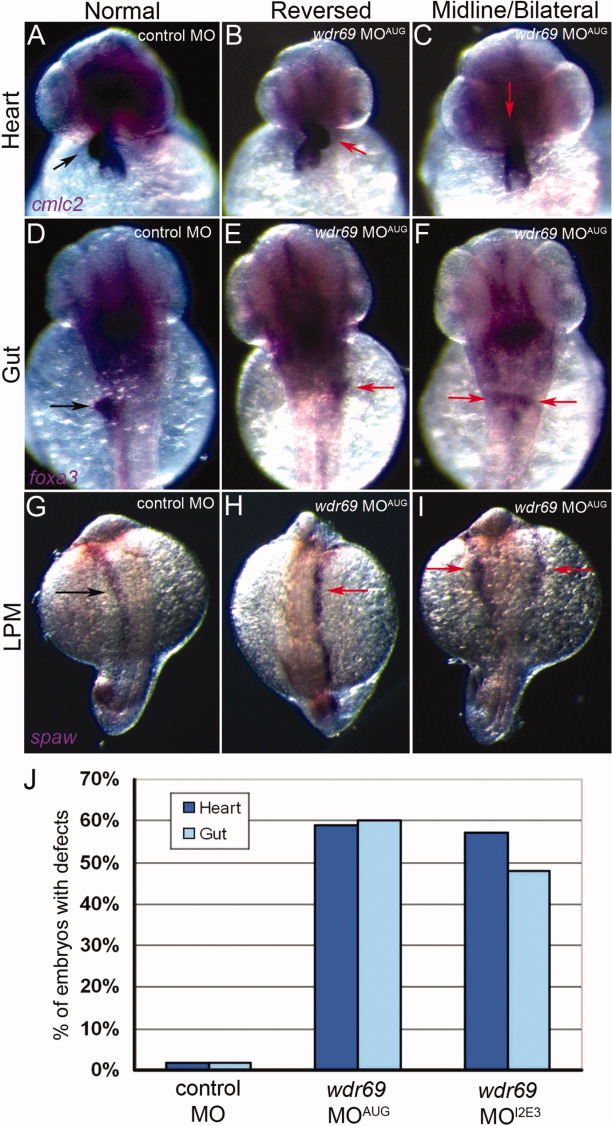 Fig. 3 Wdr69 is important for the establishment of left-right asymmetry. A-F: Analysis of organ left-right asymmetry by RNA in situ hybridizations using the heart marker cmlc2 (A-C) and gut marker foxa3 (D-F). Control morphants showed normal rightward looping of the heart (arrow in A) and left-sided orientation of the liver (arrow in D). In wdr69 MOAUG morphants, heart looping was often reversed (arrow in B) or linear along the midline (arrow in C). Similarly, liver position in wdr69 MOAUG morphants was frequently reversed (arrow in E) or bilateral (arrows in F). G-I: RNA in situ hybridizations detecting southpaw (spaw) expression in lateral plate mesoderm (LPM) at 18 somite stage (SS; G). spaw expression was restricted to left LPM cells in control morphants (arrow in G), whereas wdr69 MOAUG morphants displayed abnormal right (arrow in H) and bilateral (arrows in I) distributions of spaw expression. J: The percentage of embryos injected with control MO (n = 130), wdr69 MOAUG (n = 67) or wdr69 MOI2E3 (n = 75) showing laterality defects in the heart and gut (see also Table 1). MO, morpholino oligonucleotides (MO).