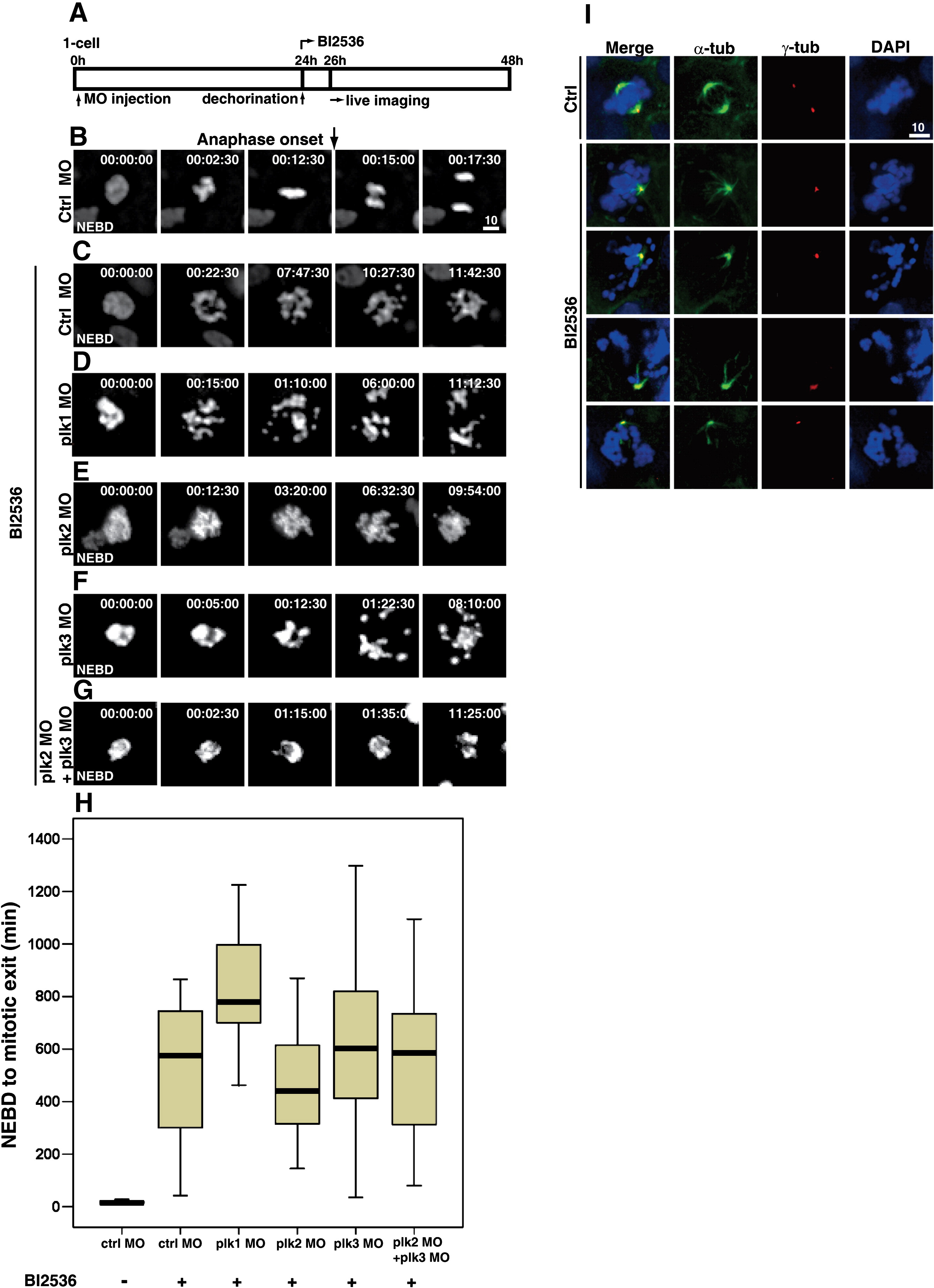 Fig. 6 Treatment of 24 hpf embryos with BI 2536, the small molecule inhibitor specific for Plk1, leads to mitotic infidelity and prometaphase arrest. (A) Scheme of BI 2536 treatment in developing zebrafish embryos. Embryos at one-to four-cell stage were injected with indicated morpholino oligos and the drug was treated at 24 hpf. (B) Captured images of cells from the control embryos. The black arrow marks the timing of anaphase onset. The time at NEBD was set to 0. (C–G) Captured images of BI 2536-treated embryos after the injection of indicated morpholinos (supplemental movies 10-14). (H) Box plots of timing from NEBD to mitotic exit. More than 50 cells from at least five embryos each were analyzed. Bars within the boxes are the median values, determined by statistical analysis using SPSS software. Note that BI 2536 treatment in plk1 morphants exhibit more severe phenotype compared to others. (I) Immunofluorescence of the fixed embryos with anti-α-tubulin and -γ-tubulin with or without BI 2536 treatment. Note the monopolar spindles in BI 2536-treated embryos.