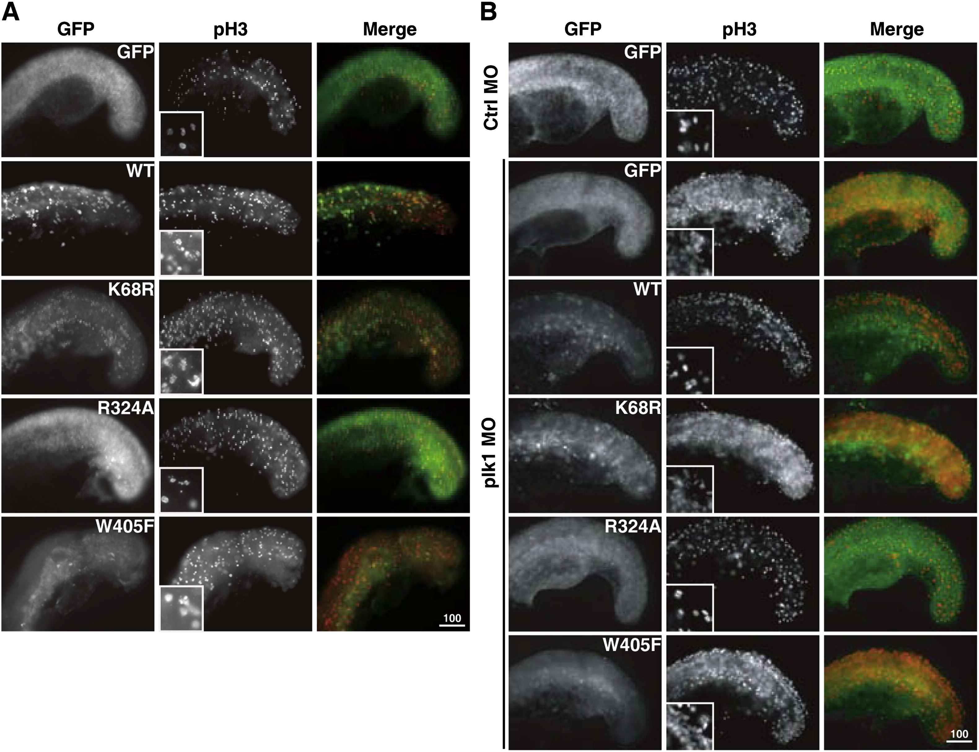Fig. 7 Injection of wild-type Plk1, kinase-dead mutant, D-box mutant, and PBD domain mutant RNAs (illustrated and marked in Fig. 1A) in wild-type and plk1 morphant embryos. Embryos were injected with various GFP-plk1 RNAs alone (A) or in combination with plk1 MO (B). Embryos were collected at the 18-somite stage and stained with anti-pH3 antibodies (red) to assess the effect of the expression of these RNAs on mitosis. Enlarged images of chromosomes stained with anti-pH3 are shown in the inner box for comparison.