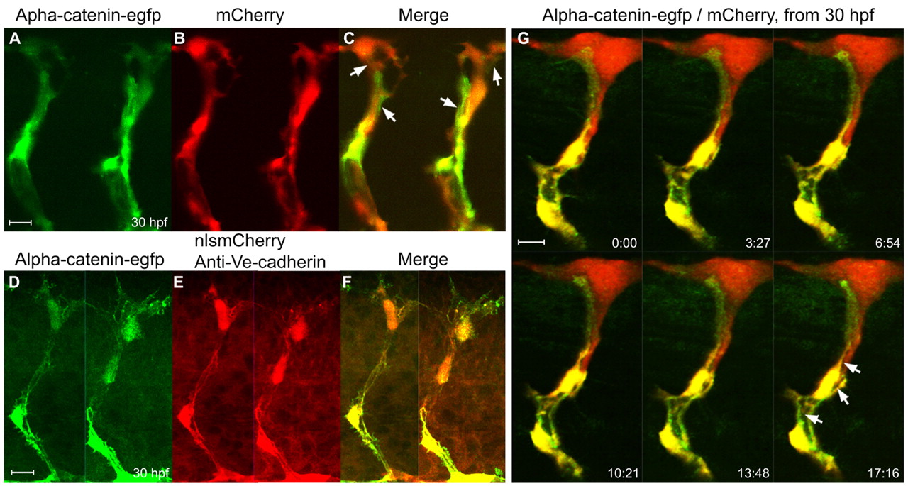 Fig. 2 α-Catenin-EGFP localizes to adherens junctions associated with the primary lumen in the ISVs. (A-C) Confocal images of the ISVs in a living Tg(flk1:α-catenin-egfp)/Tg(flk1:mCherry) zebrafish embryo at 30 hpf. Arrows in C point to long putative adherens junctions between cells. (D-F) Labeling of adherens junctions in the ISVs with anti-Ve-cadherin antibody in a Tg(flk1:α-catenin-egfp)/Tg(flk1:nlsmCherry) double-transgenic embryo. (G) Time-lapse confocal images of an ISV in a Tg(flk1:α-catenin-egfp)/Tg(flk1:mCherry) embryo showing the putative primary lumen (arrows) forming between the cellular junctions. The time format is minutes:seconds.