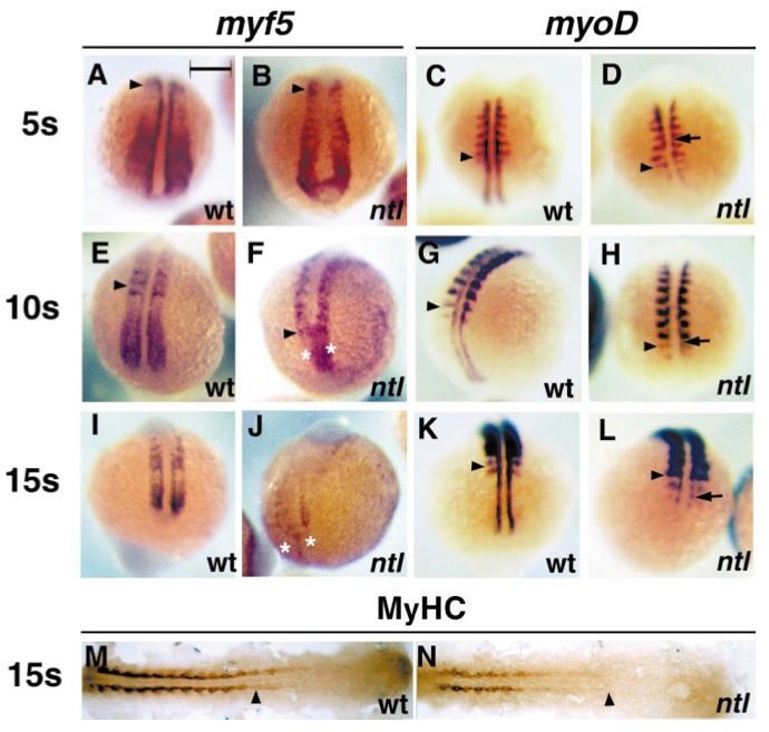 Fig. 5 Failure of adaxial myogenesis in posterior no tail embryos occurs at the Mrf induction stage. Analysis of 5 somite (A–D), 10 somite (E–H), and 15 somite (I–N) ntl embryos (B, D, F, H, J, L, N) reveals that adaxial myf5 (A, B, E, F, I, J) and myoD (C, D, G, H, K, L) expression is severely reduced at all stages and positions examined, compared to wild-type or heterozygous siblings (A, C, E, G, I, K, M). In contrast, lateral somitic expression levels of both myf5 and myoD appear unaffected by the ntl mutation at early stages. Note the delayed appearance of substantial medial myoD mRNA at somitic levels (arrows, D, H, L). myf5 mRNA accumulation in the tailbud tip is decreased at later stages of ntl development (asterisks, F) and is almost lost caudally in ntl embryos as outgrowth ceases (asterisks in J, dorsal three-quarter view, tailbud at bottom). Wholemount visualisation of all sarcomeric MyHC shows that adaxial muscle differentiation is substantially delayed in the 15 somite stage ntl embryo (M, N dorsal view, anterior to left). Bar, 200 μm in A–L and 164 μm in M, N.