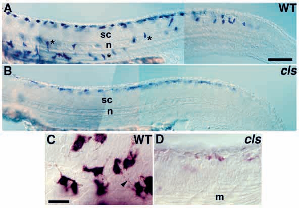 (A) Lateral view of wild-type embryo labeled for dct transcripts at 27 hpf reveals abundant melanoblasts along trunk and tail, with many along medial migration pathway (*). (B) cls- embryos have fewer melanoblasts, all dorsal to spinal cord (sc). (C) At higher magnification, wild-type melanophores show intense cytoplasmic dct-labeling (purple) and melanosomes (brown granules, arrowhead) in processes. (D) cls- melanophores show only faint dct labeling. In these and all subsequent lateral views, anterior is to the left and dorsal to the top. At both 24 and 27 hpf cls- embryos show only approximately one third the number of melanoblasts of wild types (data not shown). m, muscle fibres; n, notochord. Scale bar, 250 μm (A,B) and 50 μm (C,D).