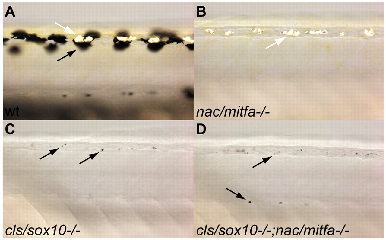 Fig. 1 Pigment cell defects in cls/sox10-/-, nac/mitfa-/- and cls/sox10-/-;nac/mitfa-/- mutant embryos. Lateral views of the dorsal trunk of 3 dpf wild type (A), nac/mitfab692/b692 (B), cls/sox10t3/t3 (C) and cls/sox10 t3/t3;nac/mitfa b692/b692 (D) embryos. Wild-type embryos have large flat melanophores (black arrow), cls/sox10-/- and cls/sox10-/-;nac/mitfa-/- embryos have a few tiny rounded melanophores (black arrows), but nac/mitfa-/- embryos lack melanophores. Iridophores (white arrows) are not reduced in nac/mitfa-/- embryos but are severely reduced in cls/sox10-/- and cls/sox10-/-;nac/mitfa-/-. Double mutant embryos were identified by PCR genotyping.