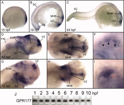 Fig. 3 Expression of the gpr177 gene in zebrafish embryos. Expression of gpr177 mRNA was analyzed by whole mount in situ hybridization (A–I). A: Early somitogenesis, lateral view. B: 18 hpf, lateral view. C: 24 hpf, lateral view. D: 48 hpf, lateral view of head. E: 48 hpf, dorsal view of head. F: 48 hpf, lateral view of ear. G: 72 hpf, lateral view of head. H: 72 hpf, dorsal view of head. I: 72 hpf, lateral view of ear. All views are anterior to the right. Arrowheads indicate protrusions of semicircular canals. BA, branchial arches; T, tectum; HB, hindbrain, MHB, midbrain-hindbrain boundary; SC, spinal cord; TB, tail bud; VZ, ventricular zone. J: Western blot containing lysates from embryonic zebrafish between 1 and 10 hpf were probed using anti-GPR177 antibodies. Data are representative of four separate experiments.