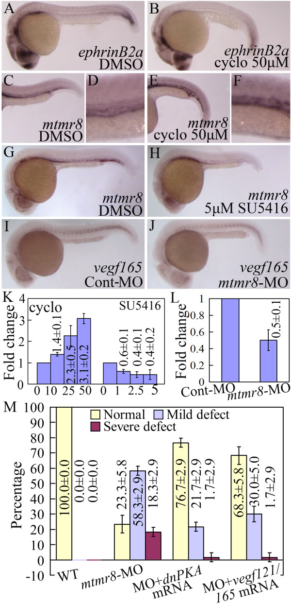 Fig. 6 (A-F) The expression of ephrinB2a (A, B) and mtmr8 (C-F) in 26 hpf embryos incubated with DMSO (A, C) or cyclopamine (B, E). (D, F) are magnification of (C, E) in the trunk vasculture. (G-H) Mtmr8 expression in 30 hpf embryos incubated with DMSO (G) or SU5416 (H). (I-J) Vegf165 expression in 26 hpf Cont-MO and Mtmr8 morphant embryos. (K) Mtmr8 expression changes revealed by Q-RT-PCR in embryos treated with different doses of SU5416 and cyclopamine (μM). (L) Vegf165 expression in 26 hpf Cont-MO and Mtmr8 morphant embryos revealed by Q-RT-PCR. (M) Statistical data of different defect phenotypes at 26 hpf in Mtmr8-MO, Mtmr8-MO+dnPKA mRNA, and Mtmr8-MO+vegf121/165 mRNA embryos.