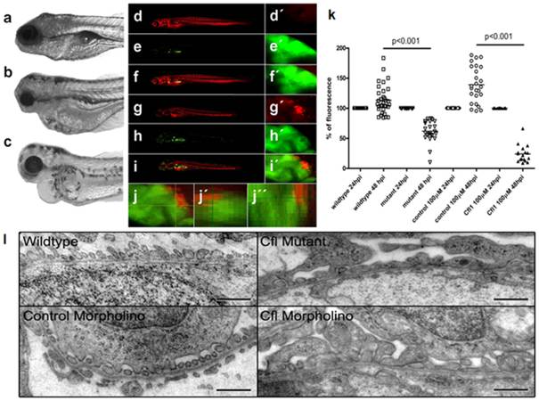 The phenotype of mutant (b) and morphant (c) embryos were compared to wildtype zebrafish embryos at 120 hpf (a). The mutant and morphant embryos had several aberrant features including edema around the yolk, pericardial effusion, smaller eyes, an arched back, jaw malformation and an absent swim bladder. Control Wt1b-GFP transgenic zebrafish (d–f, d′–f′) and those treated with cofilin-1 morpholinos (g–i, g′–i′) were injected with 70 kDa rhodamine labeled dextrans at 72 hpf and their pronephros imaged 48 hours later. The rhodamine labeled dextrans remained within the circulatory system of the Wt1b-GFP zebrafish with no labeling within the Wt1b-GFP pronephros tubules (d–f, d′–f′). In contrast, in the Wt1b-GFP transgenic morphant embryos (g–i, g′–i′), the vasculature was labeled by the rhodamine labeled dextran, but labeling was also observed within the pronephros tubules (magnification = 180×). (j–j′′) XZ cross section of the collected optical stacks clearly demonstrated the intracellular localization of rhodamine labeled dextrans within the pronephros tubules (yellow). (k) Functional studies demonstrated loss of pronephros function in cofilin-1 knockdown zebrafish embryos. Images of intravascular fluorescence were captured in retinal blood vessels and monitored in individual fish over 24 hours in control, cofilin-1 mutant zebrafish and zebrafish treated with 100µM cofilin-1 morpholinos. At forty-eight hours post injection of FITC-labeled 70 kDa dextrans into the vascular system, the fluorescence intensity in the pupil of the zebrafish increased in wildtype embryos, but decreased in zebrafish treated with 100 μM cofilin-1 morpholinos and cofilin-1 mutants. (l) TEM analysis of podocytes in control, cofilin-1 mutant and cofilin-1 morpholino treated zebrafish demonstrated severe podocyte effacement in cofilin-1 knockdown embryos. While wildtype (upper left) and control morpholino injected (lower left) zebrafish embryos have normal foot processes and slit diaphragm formation, the cofilin-1 mutants (upper right) as well as the cofilin-1 morpholino injected fish (lower right) display foot process fusion and foot process effacement over large areas (size bar: 500 nm).
