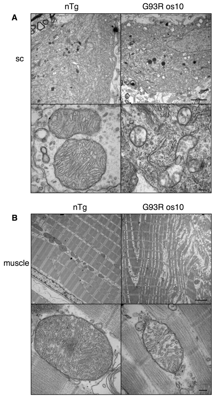 Fig. 6 Pathological changes were observed in G93R os10 spinal cord and muscle at the disease end-stage. (A) Electron microscopy of a spinal cord motoneuron from nTg sibling (left) and G93R os10 (right) adult end-stage fish. Numerous vacuolated mitochondria were observed in G93R os10 motoneurons (top) and were readily apparent at higher magnification (bottom). (B) Electron microscopy of trunk muscle from nTg sibling (left) and G93R os10 (right) fish also revealed severe abnormalities (top). The mitochondria in G93R os10 muscle also appeared to be affected, both in number and integrity, and cristae appeared to be reduced in number and lacked the normal organization (bottom). Bars, 2 μm (A,B; top panels); 150 nm (A,B; bottom panels).