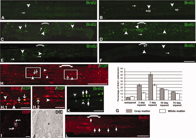 Fig. 4 Time course analysis of injury-induced cell proliferation represented after BrdU incorporation and H3P staining in uninjured and injured spinal cord. A, B: Uninjured cord shows BrdU+ cells are present both in grey matter (▼) and white matter (→) but mostly in ependyma (ep). C: 3dpi cord shows a large increase in BrdU+ cells in both grey (▼) and white (→) matter. D: A section of 7dpi cord shows a very significant increase in number of BrdU+ cells in both grey (▼) and white matter (→), and increased numbers of cells are present at the injury epicenter ([down bracket]) compared to 3dpi cord. E: A 10dpi cord shows incorporation in both white matter (→) and grey matter (π) but a considerable decrease in number of BrdU+ cells compared to 7dpi cord. F: A 15dpi cord section shows fewer BrdU+ cells in grey (▼) and white matter (→) compared to the 10dpi cord and the number is still higher than in the uninjured cord. G: Quantitative representation of BrdU+ cells in both grey and white matter of uninjured and injured cord at different time points. H: A 7dpi cord section shows BrdU+ cells (▼) and many of these are colocalized with H3P (↓) in both the injury epicenter ([down-bracket]) and adjacent part. H.1, H.2: Same 7dpi cord as in H showing adjacent area and injury epicenter, respectively, at high magnification. I, J: Another representative cross-section of 7dpi cord showing distribution of H3P+ cells (squiggly arrow) around the central canal (c) and DIC of same section. K: Ependyma of uninjured cord showing both slow-dividing (thick arrow) and fast-dividing (∨) cells. L: Section of 7dpi cord showing BrdU+ slow-dividing cells (thick arrow) after 48-hr continuous BrdU pulse. Scale bar = 400 μm (A-H), 20 μm (H.1-K), 200 μm (L).