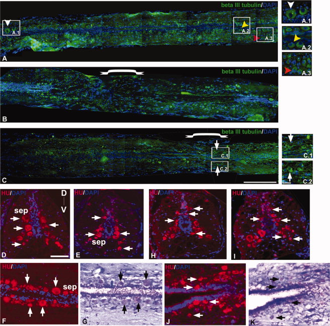 Fig. 6 Immunohistochemical staining of β-III tubulin (A-C), Hu (D–F and H-J), and counter-staining of Luxol fast blue/Cresyl violet (G and K) in zebrafish uninjured (A, D–G) and injured spinal cord (B,C, and H–K). A: Section of uninjured cord shows the spatial distribution of different types of neurons sensory neurons (white ▼), interneurons close to ependyma (yellow ▼), and motorneurons (red ▼). A.1, A.2, A.3: Higher magnification of indicated areas of A showing different types of neurons. B: 3dpi cord section showing the loss of mature neurons at the injury epicenter. C: One month post-injured cord section showing regenerated neurons at the injury epicenter. C.1, C.2: Higher magnification of indicated areas in C, where formation of new neurons (thick arrow) both at the dorsal and ventral sides can be seen. D–F: Sections of uninjured cord showing the distribution of Hu+ neurons (thick arrow) in the subependyma (sep) along the D-V axis. G: Luxol fast blue/Cresyl violet staining of F. H–J: Sections from 10dpi cord showing the presence of Hu+ newly formed neurons (thick arrow) in different locations along the D-V axis. K: Staining of the same section in J with Luxol fast blue/Cresyl violet. Scale bar = 250 μm (A-C), 50 μm (A.1-A.3, C.1,C.2, D-K).