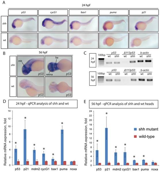 Fig. 1 (A) 24 hpf wild-type and shh-/- mutant embryos were in situ hybridised with probes against p53, cyclinG1, bax1, puma and p21 mRNAs. These p53 target genes are expressed at a higher level in the shh-/- mutant in neural tube, retina and somites than in wild-type embryos. (B) 56 hpf wild-type and shh-/- mutant embryos were hybridized with the probe against p53 mRNA. The hybridizations show increased expression of p53 in shh-/- mutant compared to wild-type embryos in the brain, retina and branchial arches. The following structures are labelled: retina, midbrain (mb) and branchial arches (ba). (C) p53 transcript isoforms in shh-/- mutant and wild-type at 24 and 56 hpf were analysed by semi-quantitative PCR assays for full-length p53, Δ113 p53 transcripts and beta;-actin transcript as a loading control. At both stages, full-length p53 and β-actin transcripts were expressed at similar levels in wild-type and mutant samples, whereas Δ113 p53 was strongly upregulated in shh-/- mutant samples. (D, E) qPCR assays for p53, p21, mdm2, cyclinG1, bax1, puma, noxa and gapdh were performed at 24 hpf (D) and 56 hpf (E) on wild-type and shh-/- mutant embryos. cDNA from whole embryos was used for 24 hpf samples and cDNA from embryo heads was used for 56 hpf samples. Gene expression was normalized using gapdh expression as reference. The panels show p53 target gene expression in wild-type and shh-/- mutant embryos (D, E). Error bars represent standard deviation and an asterisk indicates statistical significance. There are significant expression differences between wild-type and shh-/- mutant samples (t-test, * - p<0.05) for all genes except noxa. qPCR assays were performed in triplicates on three different clutches of embryos and standard deviations are shown.