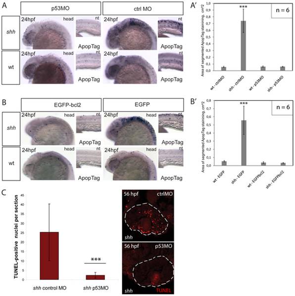 Fig. 2 (A) Apoptosis labelling using ApopTag staining in wild-type and shh-/- mutant embryos at 24 hpf after injection of p53 morpholino or control morpholino. The whole-mount images of the head (head) and neural tube (nt) are shown. (A′) Quantification of ApopTag signal area in wild-type and shh-/- mutant embryo head images from (A) shows that p53MO successfully decreased apoptosis in shh-/- mutant to the wild-type level. Asterisks (***) on top of the shh-/- mutant bar indicate its significant statistical differences from other samples (t-test, P-value<0,001). (B) Apoptosis labelling using ApopTag staining in wild-type and shh-/- mutant embryos at 24 hpf after injection of of EGFP-bcl2 or EGFP mRNA. The whole-mount images of the head (head) and neural tube (nt) are shown. (B′) Quantification of ApopTag signal area in wild-type and shh-/- mutant embryo head images from (B) shows that EGFP-bcl2 successfully decreased apoptosis in shh-/- mutant to the wild-type level. Asterisks (***) on top of the shh-/- mutant bar indicate its significant statistical differences from other samples (t-test, P-value<0,001). (C) Retinal apoptosis observed in shh-/- mutant at 56 hpf was suppressed by injection of p53 morpholino but not by injection of control morpholino (n = 10 and 40 sections for shh-/- mutant injected with p53 morpholino; n = 10 and 34 sections for shh-/- mutant injected with control morpholino). *** - t-test, P-value<0,001.