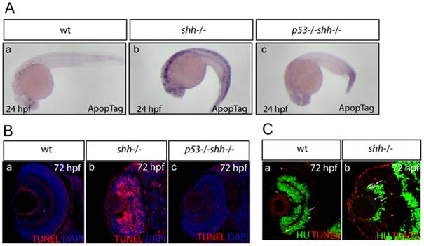 Fig. 3 Apoptosis was assayed in whole-mount embryos using ApopTag (A, a-c) and on retinal sections using TUNEL labelling (B, a-c). The sections are oriented with their anterior side to the top. Elevated apoptosis in shh-/- mutant embryos compared to wild-type embryos was suppressed by p53 loss in the developing nervous system (A, a-c) and in the retina (B, a-c). (A) Whole-mount ApopTag staining at 24 hpf of wild-type, shh-/- and p53-/-shh-/- embryos (a-c). (B) TUNEL/DAPI staining of retinal sections of wild-type, shh-/- and p53-/-shh-/- embryos at 72 hpf (a-c). (C) Wild-type (a) and shh-/- mutant (b) retinal cryosections from 72 hpf embryos stained with anti-HU antibodies to detect retinal neurons and TUNEL to label apoptotic cells. Cells positive for both HU and TUNEL are indicated with arrows and cells positive only for TUNEL are labelled with arrowheads. Images were obtained from retinal sections of 10 embryos and representative overlay images are shown.