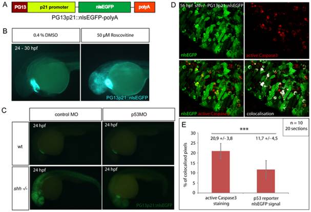 Fig. 4 (A) p53 reporter PG13p21::nlsEGFP-polyA was constructed using Tol2kit as described in Materials and methods. It consists of the p21 promoter fused with p53-binding enhancer sequence PG13, nlsEGFP coding sequence and a polyadenylation signal (polyA). (B) Wild-type embryos carrying the p53 reporter transgene were incubated for 6 hours at 24 hpf with either 50 μM Roscovitine or 0.4% DMSO diluted in E3 medium. DMSO-treated embryos did not show any significant expression of the reporter (right), whereas roscovitine-treated ones expressed p53 reporter at a high level (left). All embryos showed green-heart transgenesis marker. The experiment was repeated three times and 20 embryos were used for each treatment. (C) p53 morpholino but not 4-mismatch control morpholino injection suppressed expression of PG13p21::nlsEGFP p53 reporter in shh-/- mutant embryos at 24 hpf. Both injections had no effect on p53 reporter expression in the wild-type embryos. (D) Anti-active Caspase3 staining of cells in the shh-/- mutant retina at 56 hpf expressing p53 reporter transgene PG13p21::nlsEGFP. Most cells positive for active Caspase3 also expressed p53 reporter transgene. Single channel, overlay and co-localisation analysis images are shown. (E) Quantification of co-localisation of active Caspase3 staining and nlsEGFP p53 reporter signal. Co-localised pixels made up 20,9 +/- 3,8% of total active Caspase3 pixels and 11,7 +/ 4,5% of total nlsEGFP pixels. Quantifications were performed on 20 retinal section images from 10 embryos. Asterisks (***) indicate a significant statistical difference between the proportions (t-test, P-value<0,001).