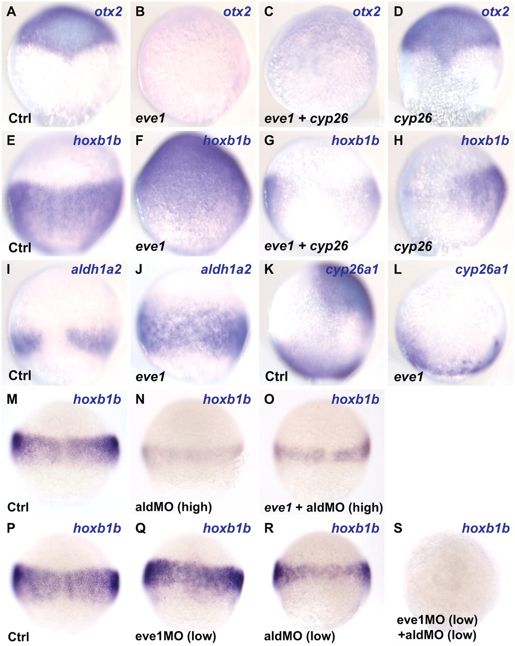 Fig. 3 Eve1 induces hoxb1b expression via an RA signal. (A–J and M–S) Dorsal and (K and L) lateral views (where discernible, dorsal to the right) of zebrafish embryos fixed for in situ staining at 80% epiboly (A–L) and 60% epiboly (M–S) Injections are indicated at the bottom left of each panel, and genes analyzed are given at the top right. (A–D) Suppression of otx2 by eve1 does not depend on RA because it resists overexpression of the RA-metabolizing enzyme Cyp26a1. (E–H) Eve1-mediated induction of hoxb1b does not occur when eve1 and cyp26a1 mRNAs are coinjected (G), and cyp26a1 injection alone suppresses hoxb1b expression (H; only one of two cells was injected in this embryo). (I and J) Eve1 induces aldh1a2 expression. (K and L) Anterior expression of cyp26a1 is suppressed by eve1 but remains unaffected at the margin. (M–O) Injection of high concentrations of aldMO and eve1 mRNA (Materials and Methods). Eve1 cannot rescue hoxb1b expression in aldMO-injected embryos (O). (P–S) Injection of low concentrations of eve1MO (2 ng/nL) and aldMO showed synergism in the suppression of hoxb1b.