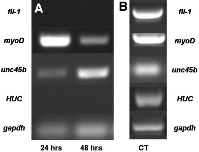 Fig. 5 Expression of markers for endothelial, neuronal, and myogenic differentiation in ZEB cultures. ZEB cultures derived from multiple WT embryos were established and collected at 24-h intervals to obtain RNA for analysis by RTpolymerase chain reaction (PCR). (A) Detection by RT-PCR of endothelial (top row), myogenic (second and third row), and neuronal (fourth row) marker transcript expression. No fli1 (endothelial) or HUC (neuronal) marker transcription was detected in optimized ZEB cultures, whereas myoD and unc45b (muscle) transcripts were detected throughout the 2 days of culture. gapdh (fifth row) served as a positive control. (B) Control RT-PCR used bulk RNA prepared from combined embryos from 4 h to 3 days postfertilization.