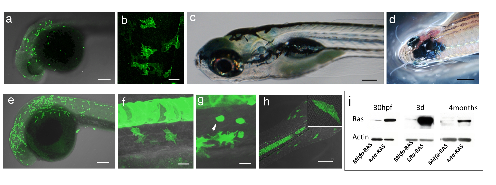 Fig. S4 Similarities and differences between mitfa-GFP-RAS and kita-GFP-RAS transgenic lines. a–b, e–f) Similar expression pattern, but different number of GFP-RAS migrating melanocyte progenitors at 32 hpf in mitfa-GFP (a,b) and kita-GFP (e,f) double transgenic zebrafish. c) Normal pigmentation in a 5 dpf mitfa-GFP-RAS larva. d) The only melanoma that developed in mitfa-GFP-RAS fish by three months of age (n = 25). g–h) Other cell types expressing GFP under the kita promoter. Melanocytes and mucous cells (arrows) in kita-GFP 3dpf larvae (g). Flat epithelial cells (enlarged in inset), present in the fins of kita-GFP 3 dpf larvae (k). These cells do not change in number or size upon expression of HRAS. i). Western Blot analysis of protein extracts from double transgenic fish at the age indicated in the upper lane. Increased levels of Ras in kita:GFP-RAS versus mita:GFP-RAS fish. Calibration bars: 50 μm in a–b;e–n; 2 mm in c–d.