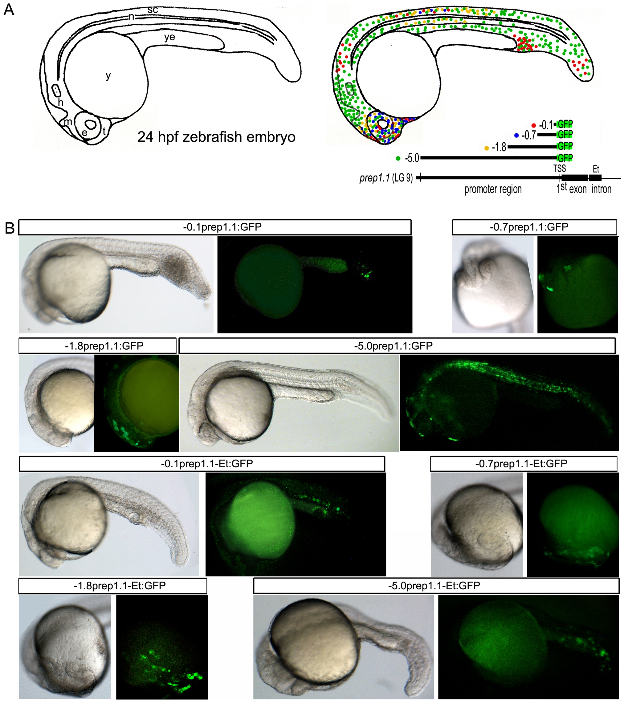 A) Schematic drawing of a 24 hpf zebrafish embryo, in which the main anatomical features are shown. On the same drawing, the transient expression patterns of all the zebrafish promoter contructs used for the analysis are reported: each dot corresponds to a group of GFP-positive cells, whereas each color is related to different promoter region (see map below). This pattern is the result of dozens of observations (see Table 3) manually annotated after each microinjection experiment and stereomicroscope observations. B) For each construct (indicated in the stripe at the top of each figure), a representative image of its transient expression in vivo is shown. Sometimes the entire embryo is shown (in the lateral view), sometimes only the anterior region (in frontal or lateral view). e, eye; Et, intronic enhancer; h, hindbrain; m, midbrain; n, notochord; sc, spinal chord; t, telencephalon; TSS, Transcription Start Site; y, yolk; ye, yolk extension.