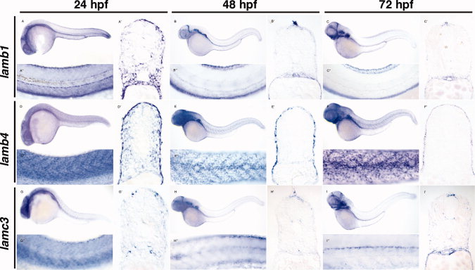 Fig. 6 Lamb1, lamb4, and lamc3 show specific spatial and temporal expression in the zebrafish myotome by in situ hybridization. A–I: Lateral view, whole mount. A′–I′: Lateral view of trunk musculature. A″–I″: Transverse section through the trunk musculature. At 24 hpf (A, A′, A″), lamb1 expression is seen in the fast and slow muscle, which by 48 hpf (B, B′, B″) and 72 hpf (C, C′, C″) extends to the apices of the myotome. Lamb4 is expressed in the fast and slow muscle at 24 hpf (D, D′, D″) and in the skin at 48 hpf (E, E′, E″) and 72 hpf (F, F′, F″). At 24 hpf (G, G′, G″), lamc3 expression is in two stripes along the trunk musculature and at 48 hpf (H, H′, H″) and 72 hpf (I, I′, I″) is expressed in the gut and neural tube.